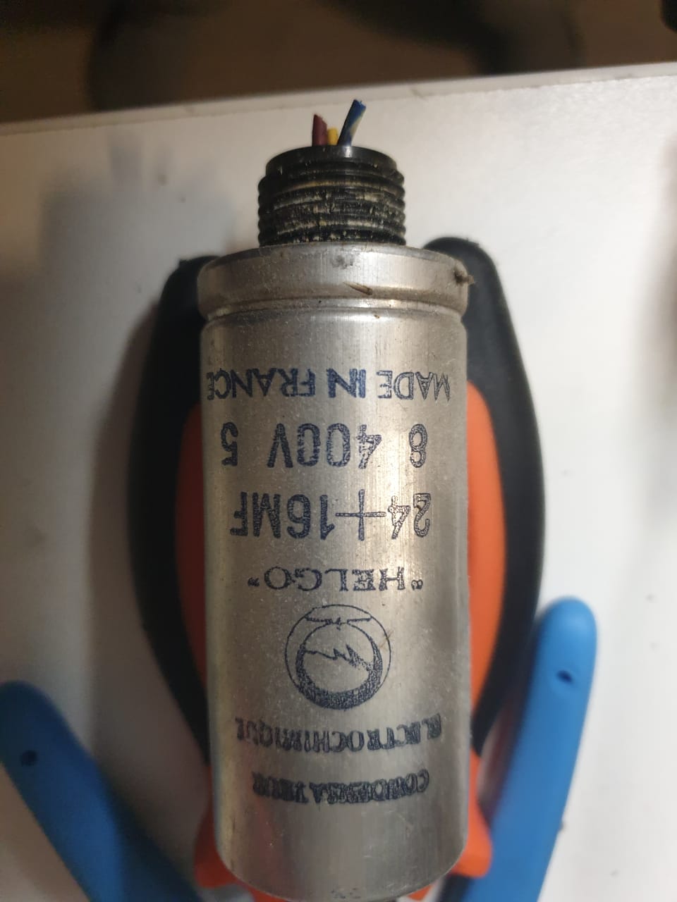 Mon problème de départ concernait un condensateur HELGO 24 + 16 µF à 4 fils (noir, rouge, jaune, bleu), ce qui m’a longtemps fait penser à la présence de trois condensateurs distincts .