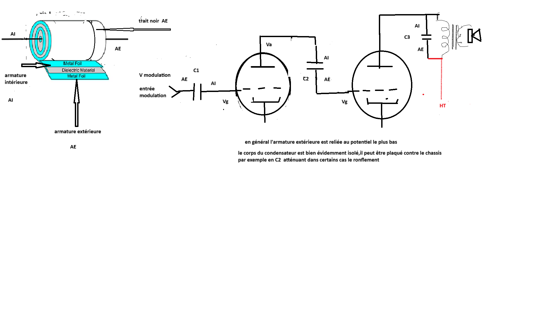 (le +HT étant, du point de vue audio, le point froid du point de vue signaux B.F car retournant à la masse en alternatif a travers la faible impédance des condensateurs chimiques de filtrage d’alimentation)