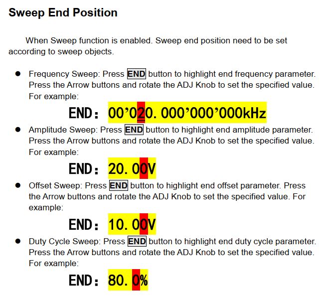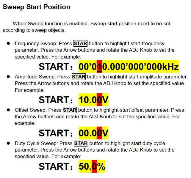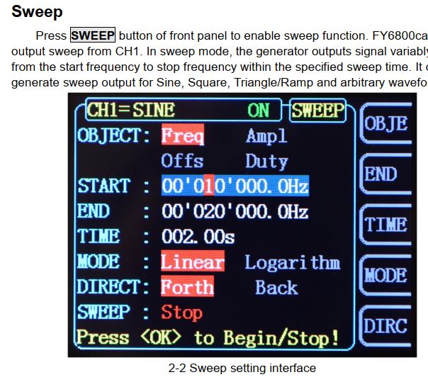 Aller dans « mod » puis « func » pour faire défiler les fonctions de modulation et il y a sweep en mode linéaire ou log. Après il suffit de sélectionner le start stop et la période de balayage.