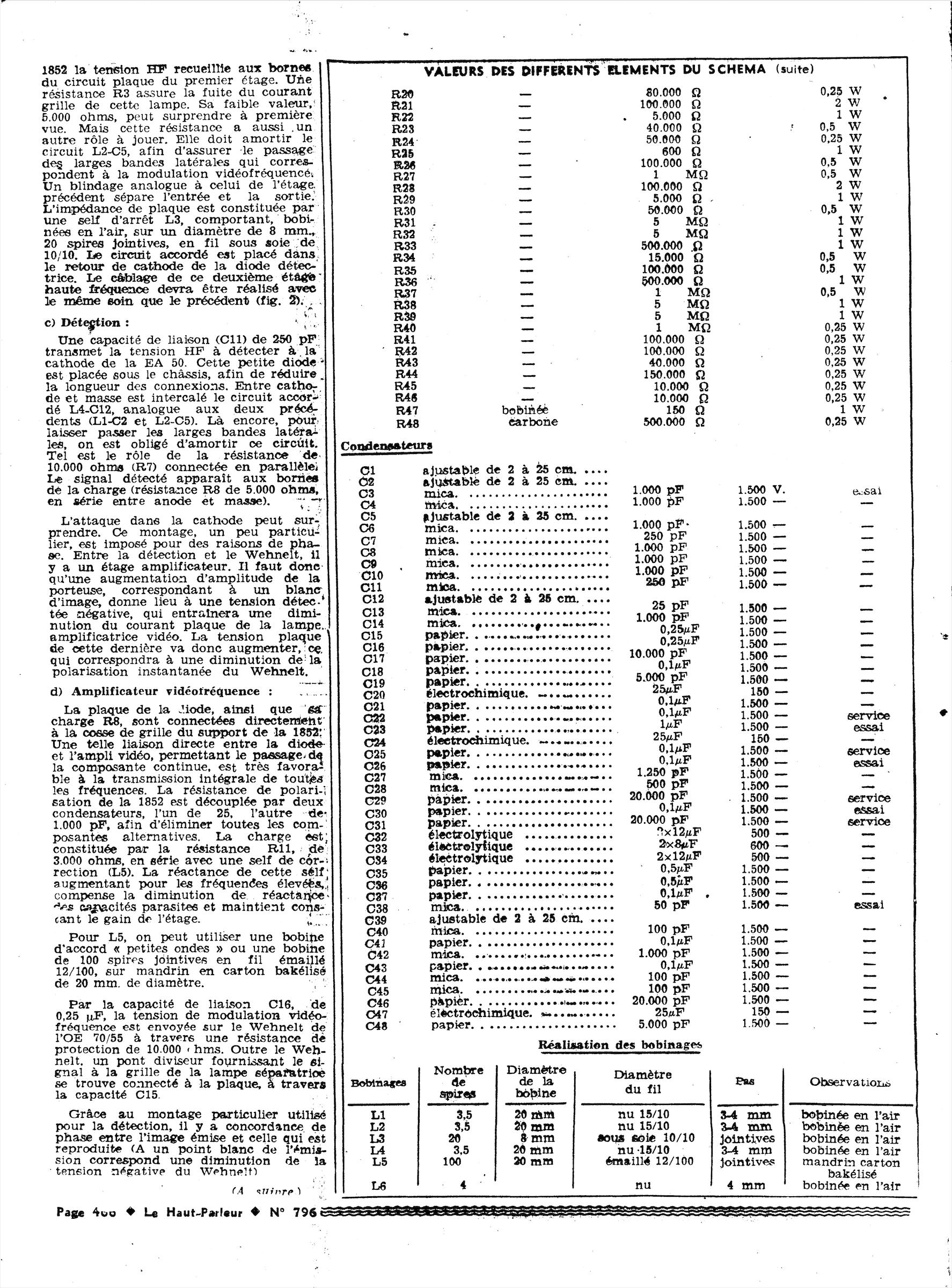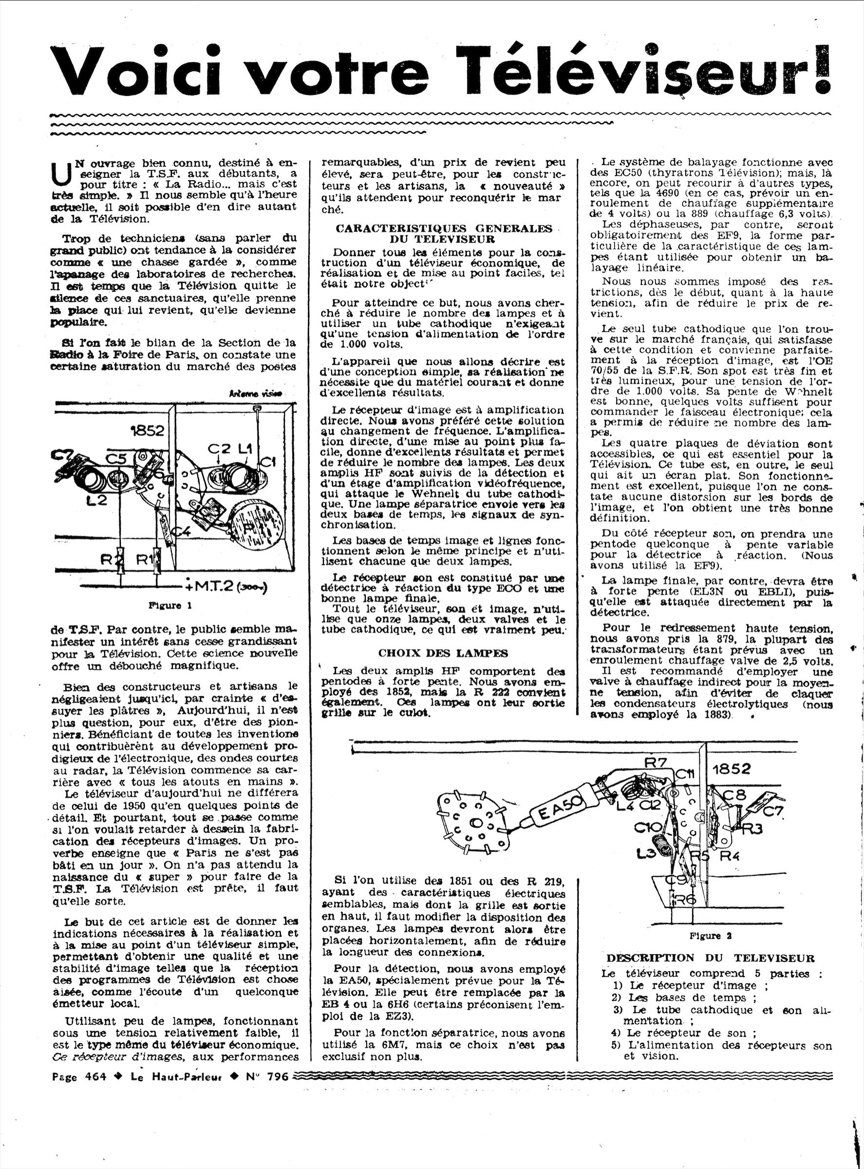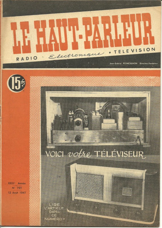 Pour info, un montage très proche est décrit dans « Le Haut Parleur » N°796 & 797 (juillet et aout 1947), c’est en partant de cette base que je réalise mon téléviseur. La photo en couverture, ci dessous, correspond en tous points au plan de câblage du bouquin de Géo Mousseron, qui diffère sensiblement dans la disposition de ce qui est décrit dans l’article. Dans les pubs du bouquin, il est dit que les établissements « Laurent » commercialisent ce poste, monté ou en kit, c’est surement celui de la couverture du magazine.