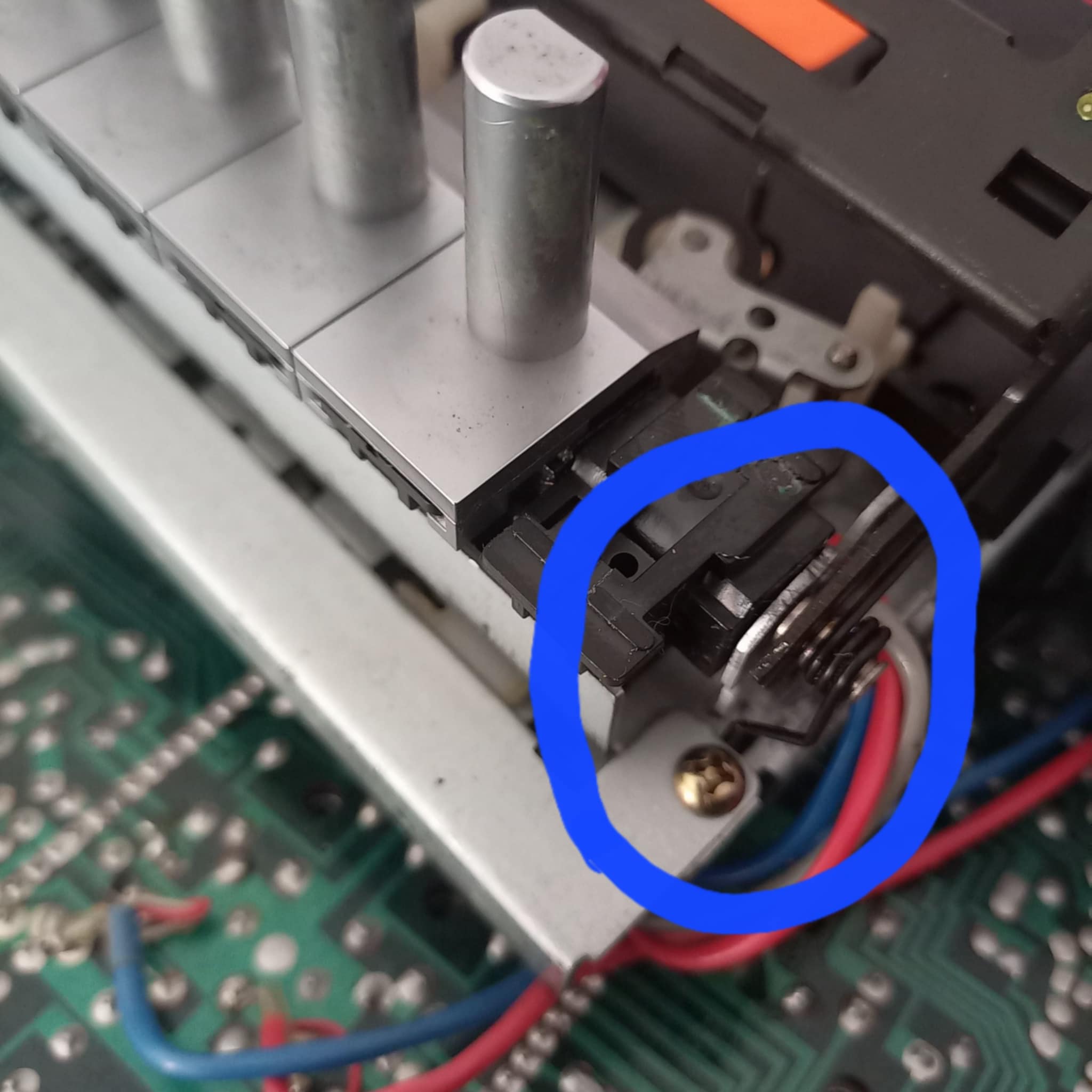 Le ressort qui se trouve en bas à droite du boitier de k7 (voir schéma et photo à suivre) me semble cassé mais je n’en suis pas sûr.