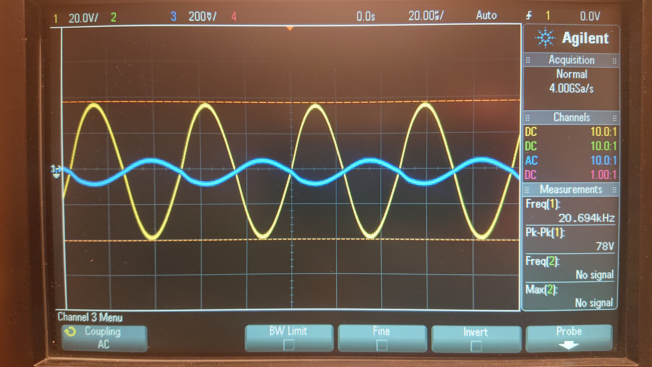 Le signal sinusoïdal à la sortie de l’oscillateur LC semble très propre. Vin_{ac}=78 Vpp F_{res}=21 KHz.