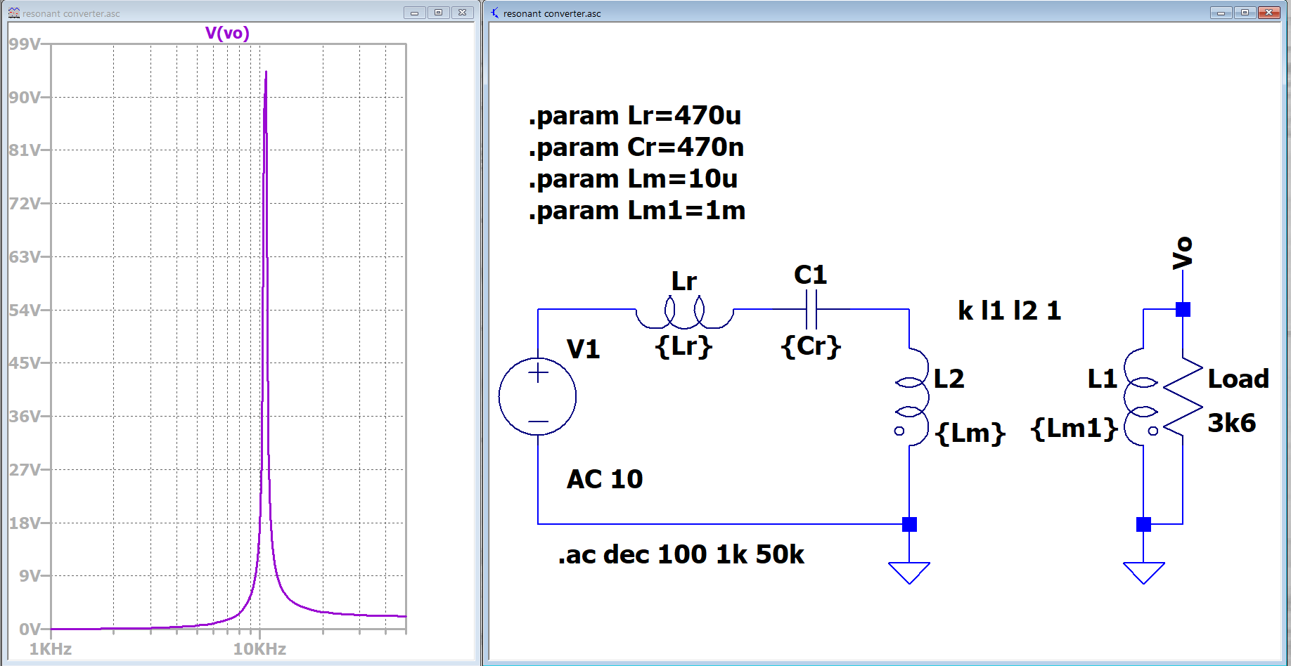 J’ai ciblé la fréquence de résonance aux alentours de 20 kHz qui permet d’obtenir le courant de sortie nécessaire à 90V avec des petits condensateurs de 220 nF.