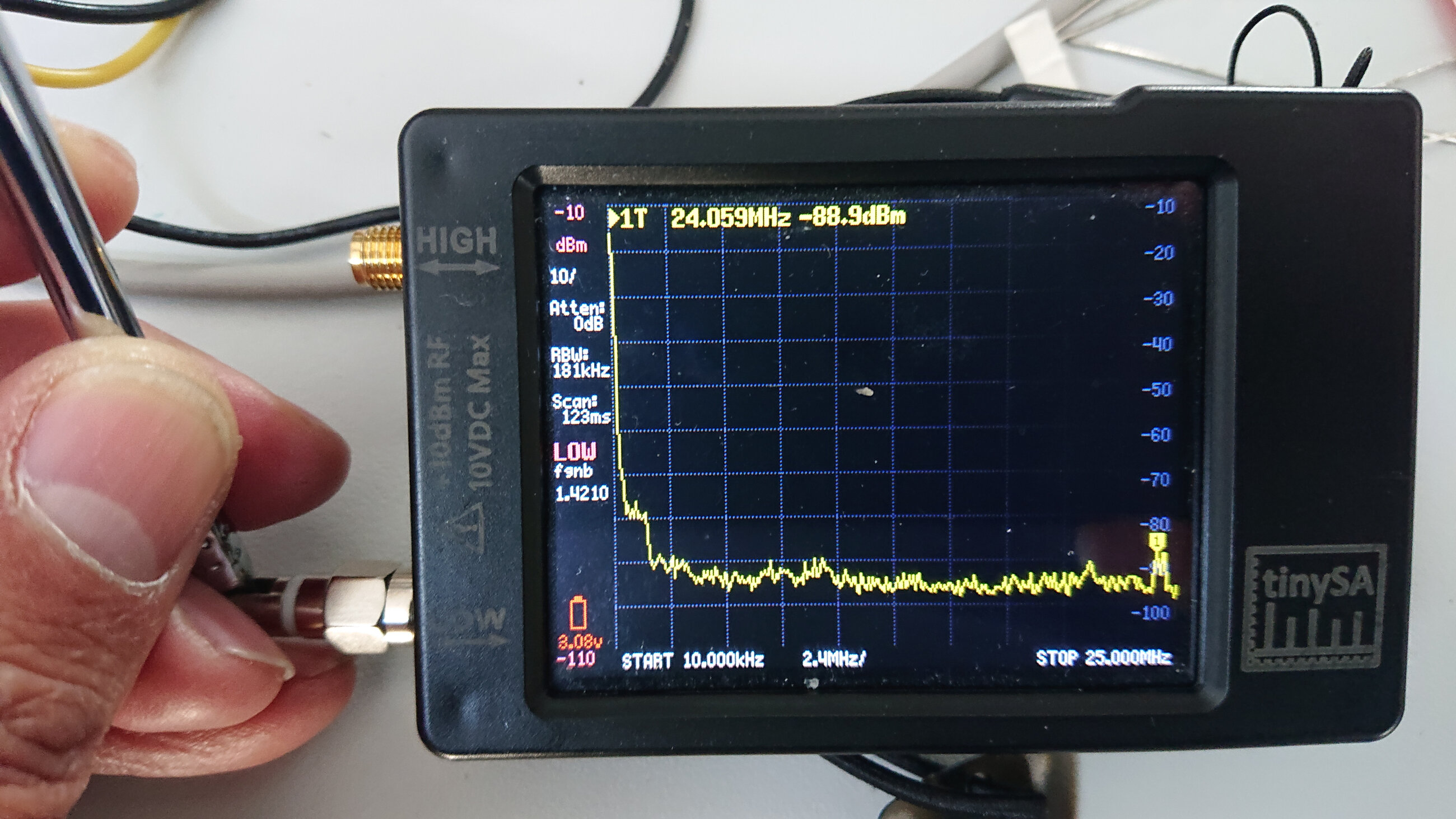 C’est bien un bruit de commutation des diodes du multiplicateur/redresseur car il disparaît quand il n’y a pas de charge bien que le circuit push-pull continue à osciller. Avec TinySA on voit bien ce bruit aux alentours de 8.4 MHz quand la charge est connectée (à gauche) et ce bruit disparaît quand la chargé est déconnectée (à droite).