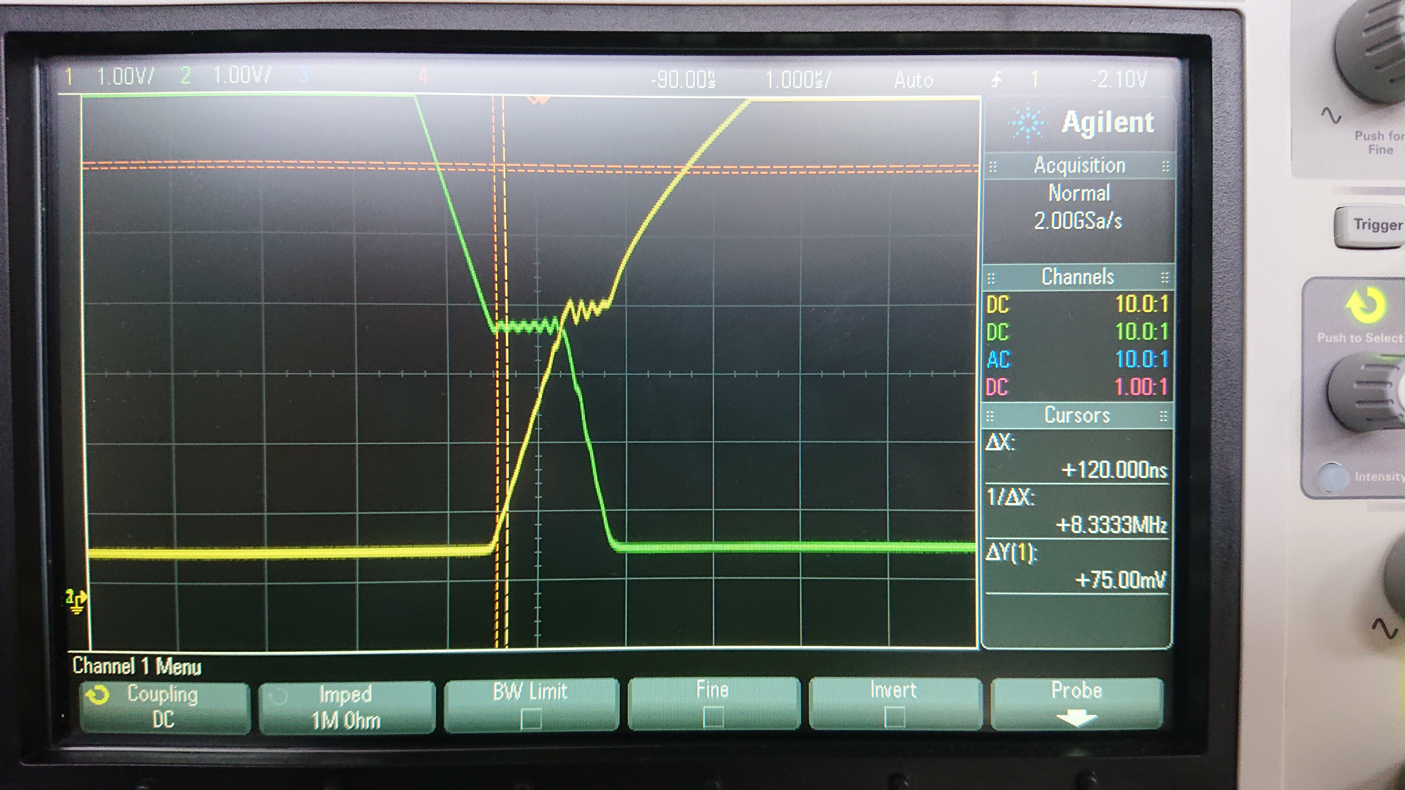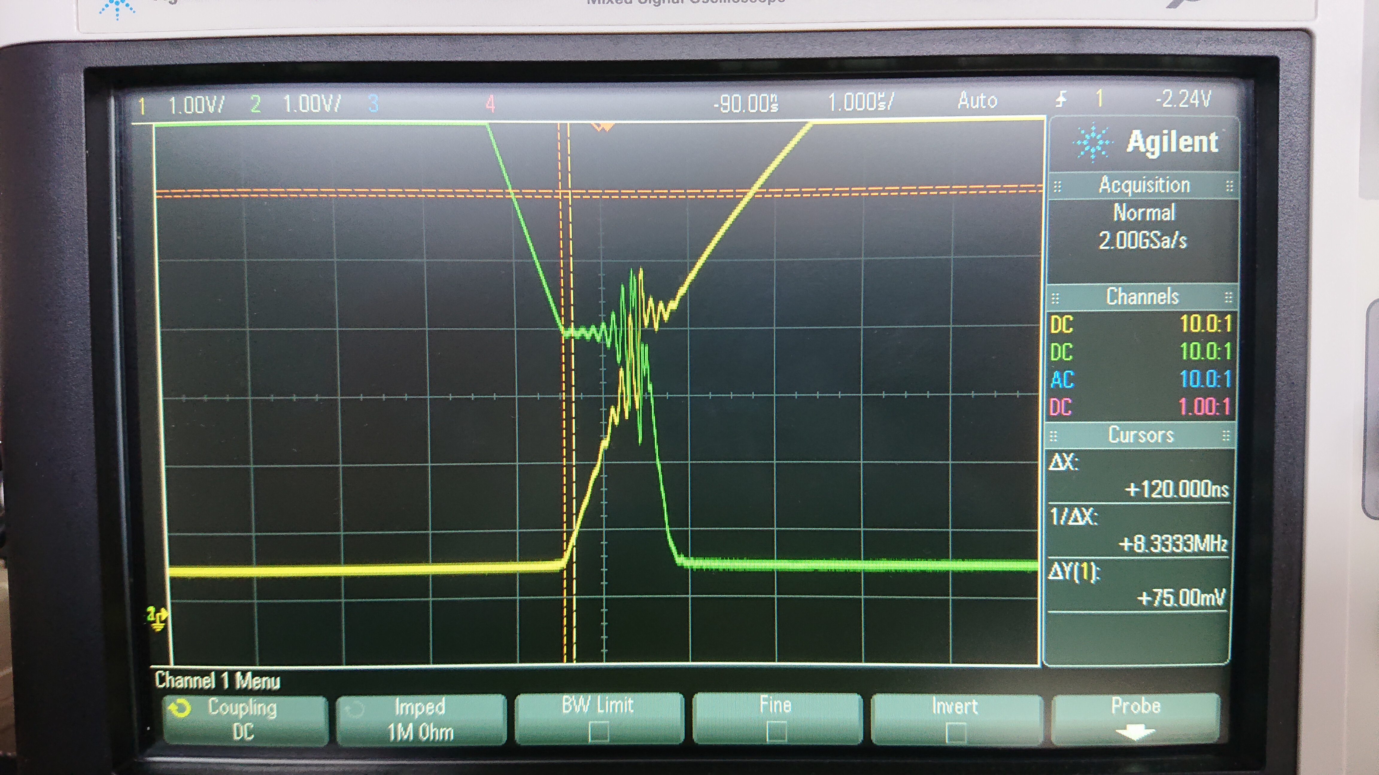 Sur la photo ça ne se voit pas mais un faible bruit de commutation est présent avec une sur-oscillation (ringing) près du passage par zero