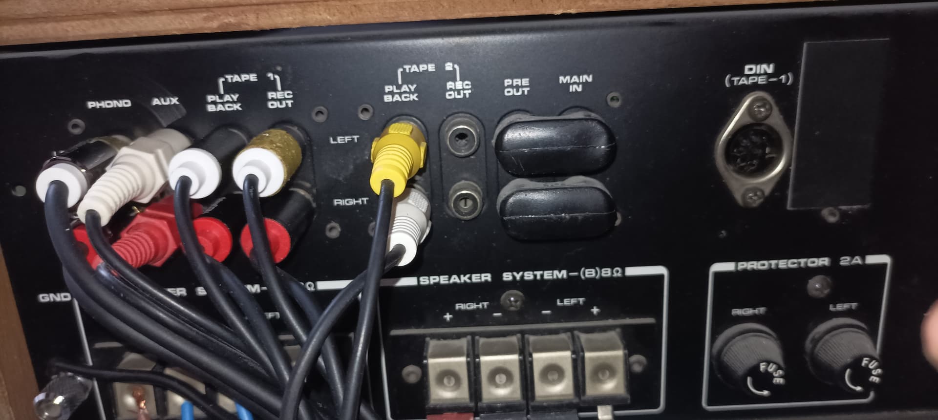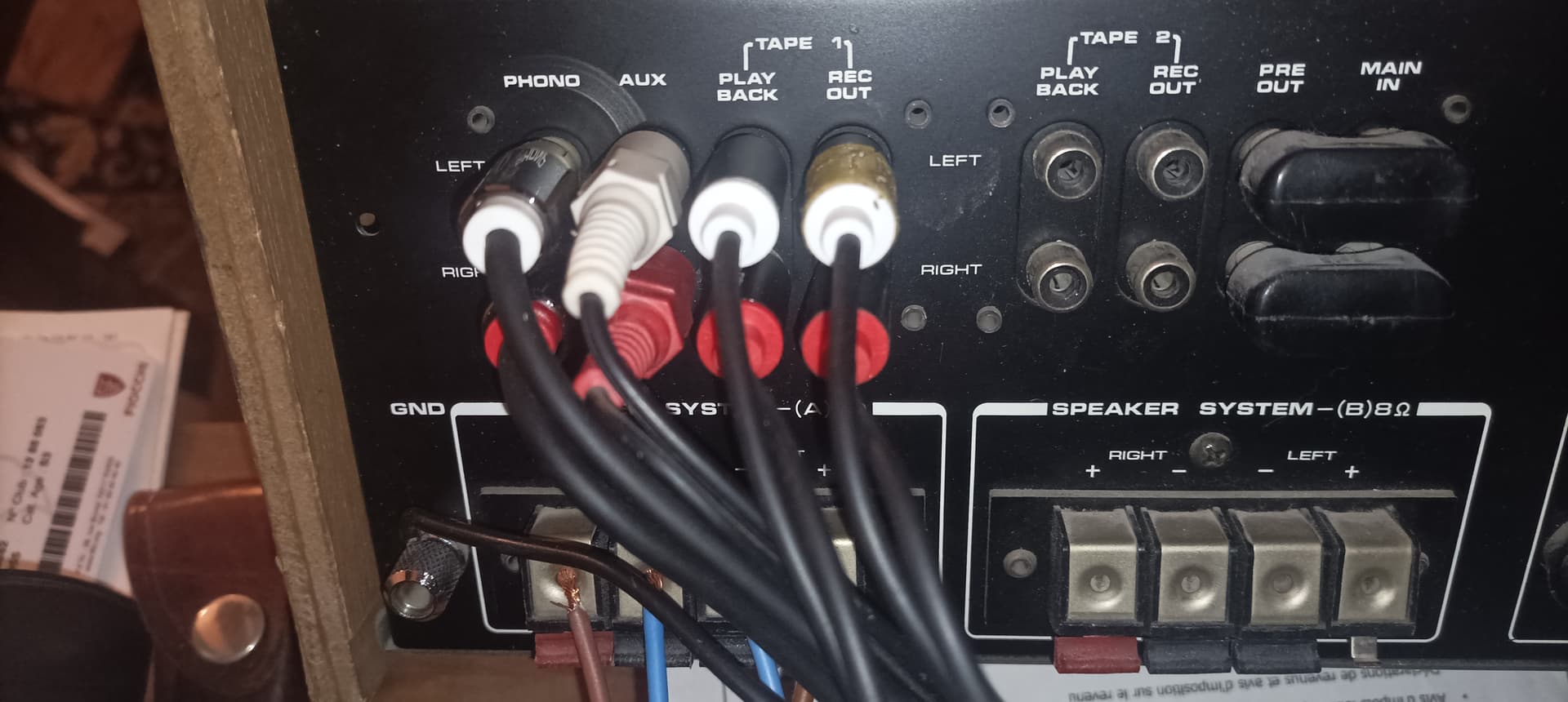 Branchement au-dessus, reproduction par l’ampli-tuner , sur les 2 voies , avec une qualité très correcte. On progresse !!