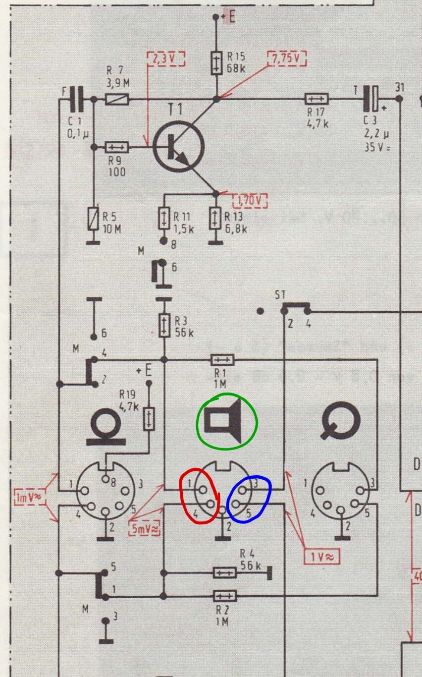 Les contacts 1 et 4 (entourés de rouge) sont prévus pour l’enregistrement et câblés comme on peut l’observer en parallèle sur l’entrée micro avec un niveau d’entrée audio indiqué de 5 mV.