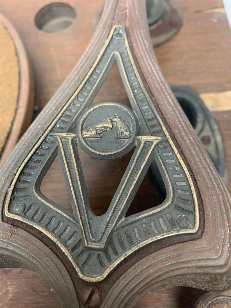 aucune inscription visible . rien sur le dessus du bras : la découpe supérieure n’ est pas la même, je n’ ai pas de V ni de logo avec Nipper . aucune inscription sur le bras ou la tête de lecture avec aiguille .