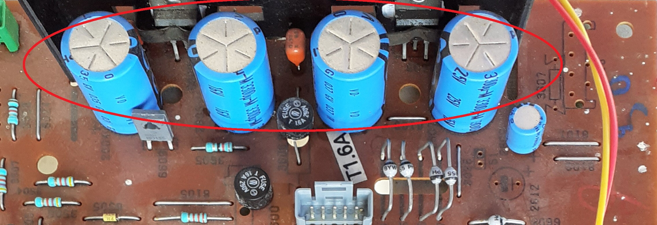 Un condensateur électrochimique ne dissipe pas de chaleur , mais les 2 transistors de puissance que l’ on voit à coté montés sur radiateur. On remarque 2 fusible soudés( galère pour le changer quand il a claqué ! ), temporisé 1,6 A !
