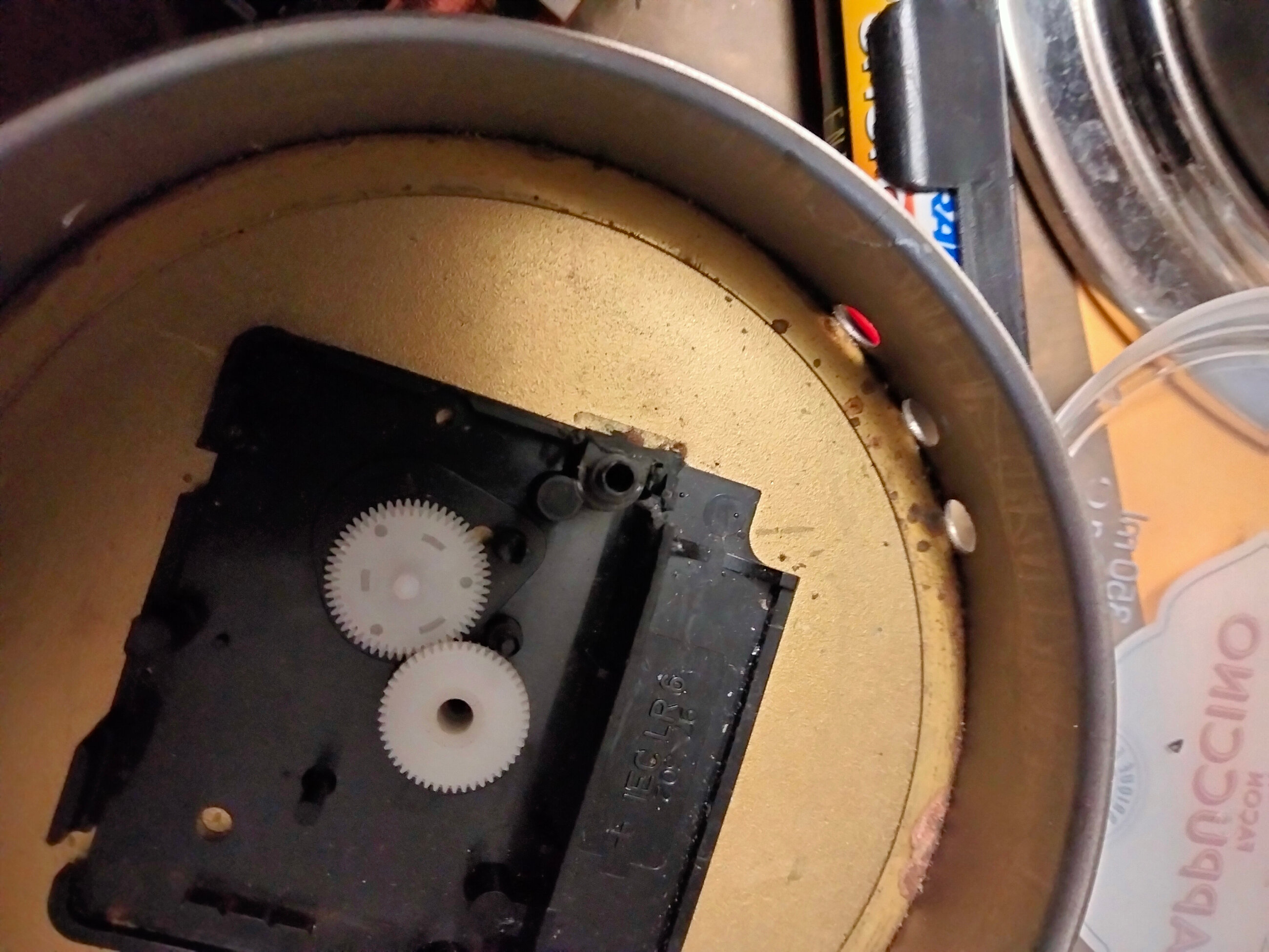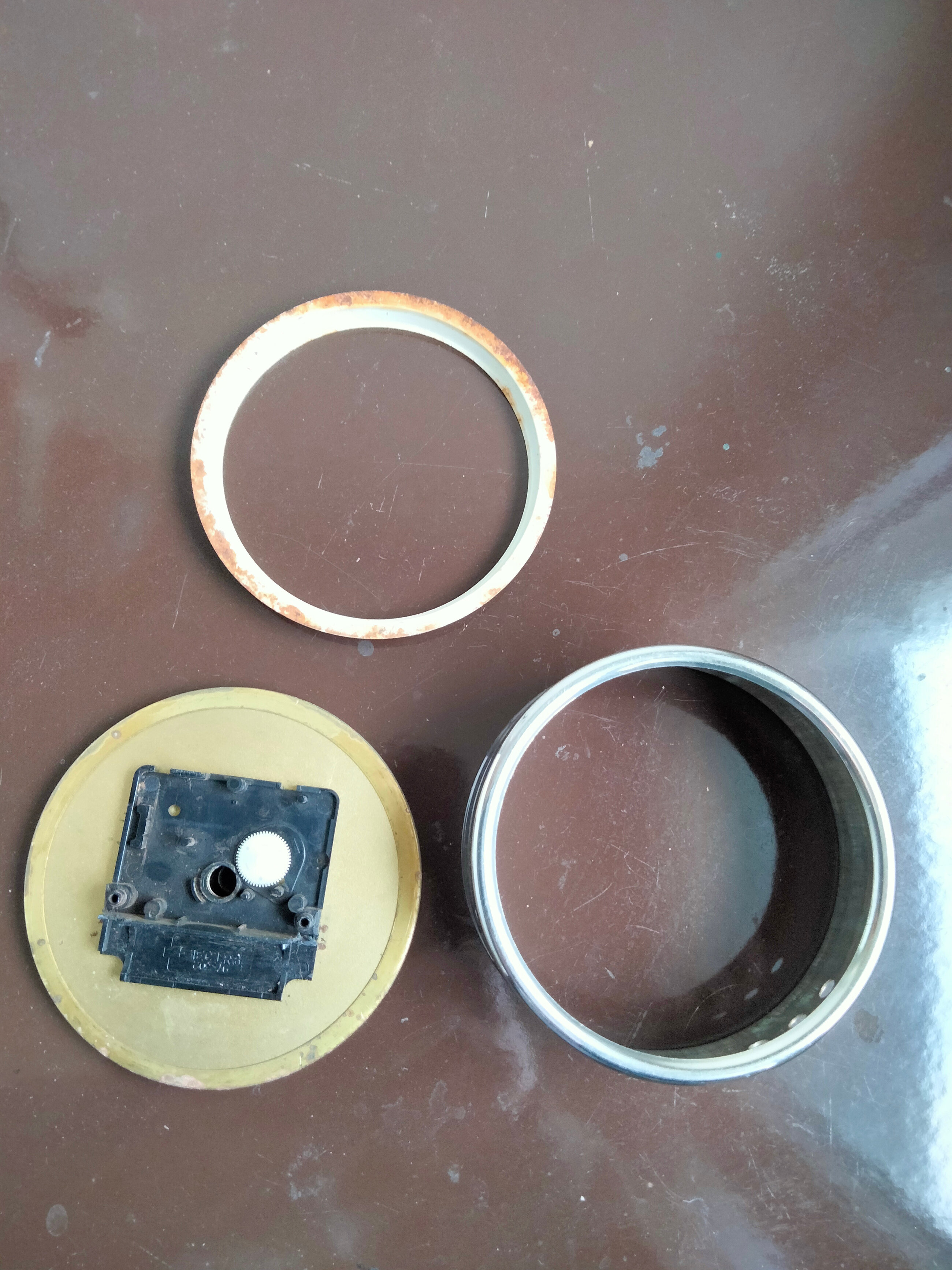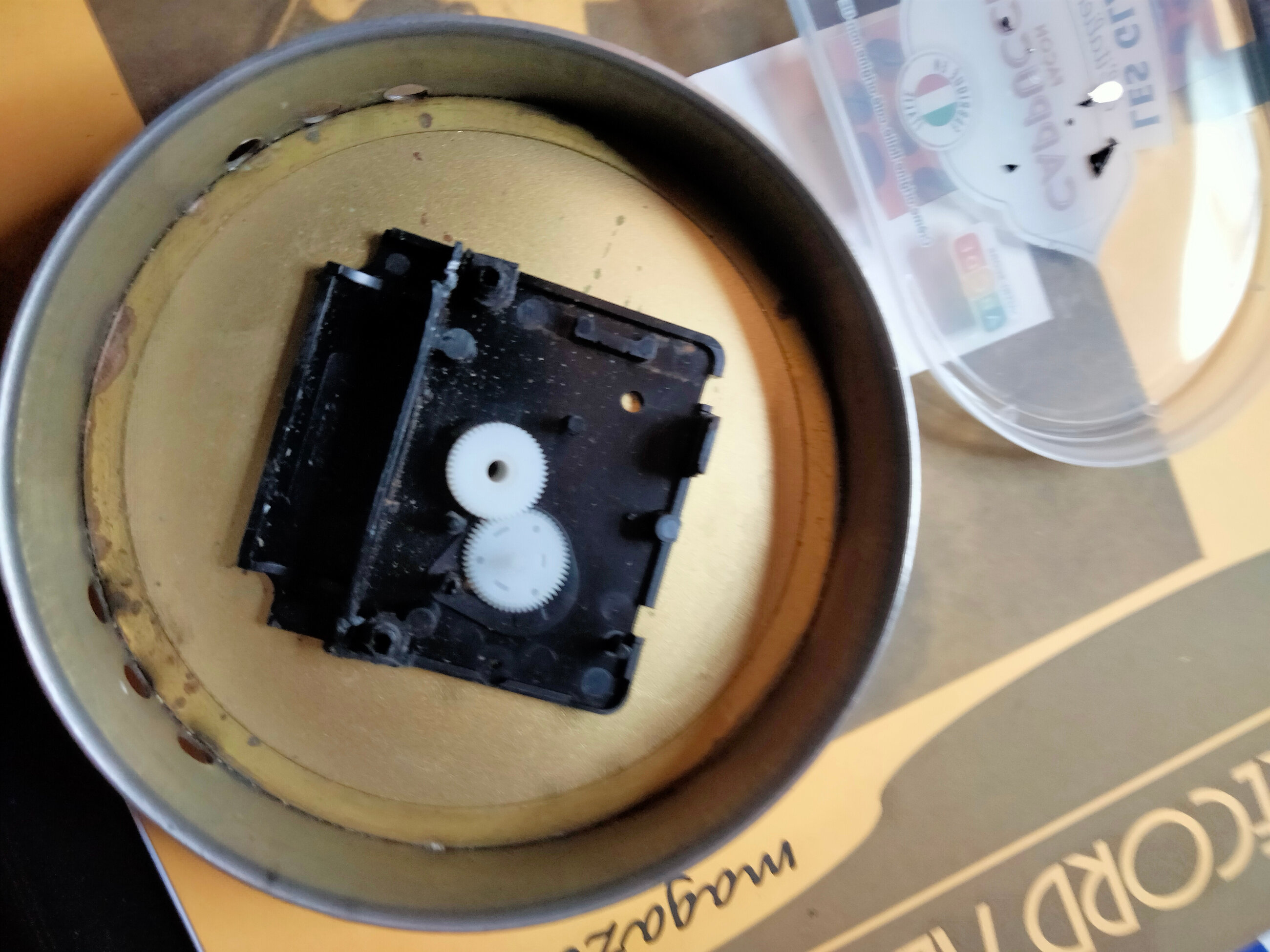 Comme la vitre du cadran ne semble pas en verre mais dans un matériaux dont j’ai oublié le nom (et je suis impardonnable car j’ai travaillé dans une boite où on usinait des vitres de cadrans dans ce matériaux) et que en prime j’ai retrouvé dans mon bordel une vitre compatible provenant de surplus de mon ancien boulot je vais frapper sur le cadran pour pousser sur le cadran et le support du mécanisme.