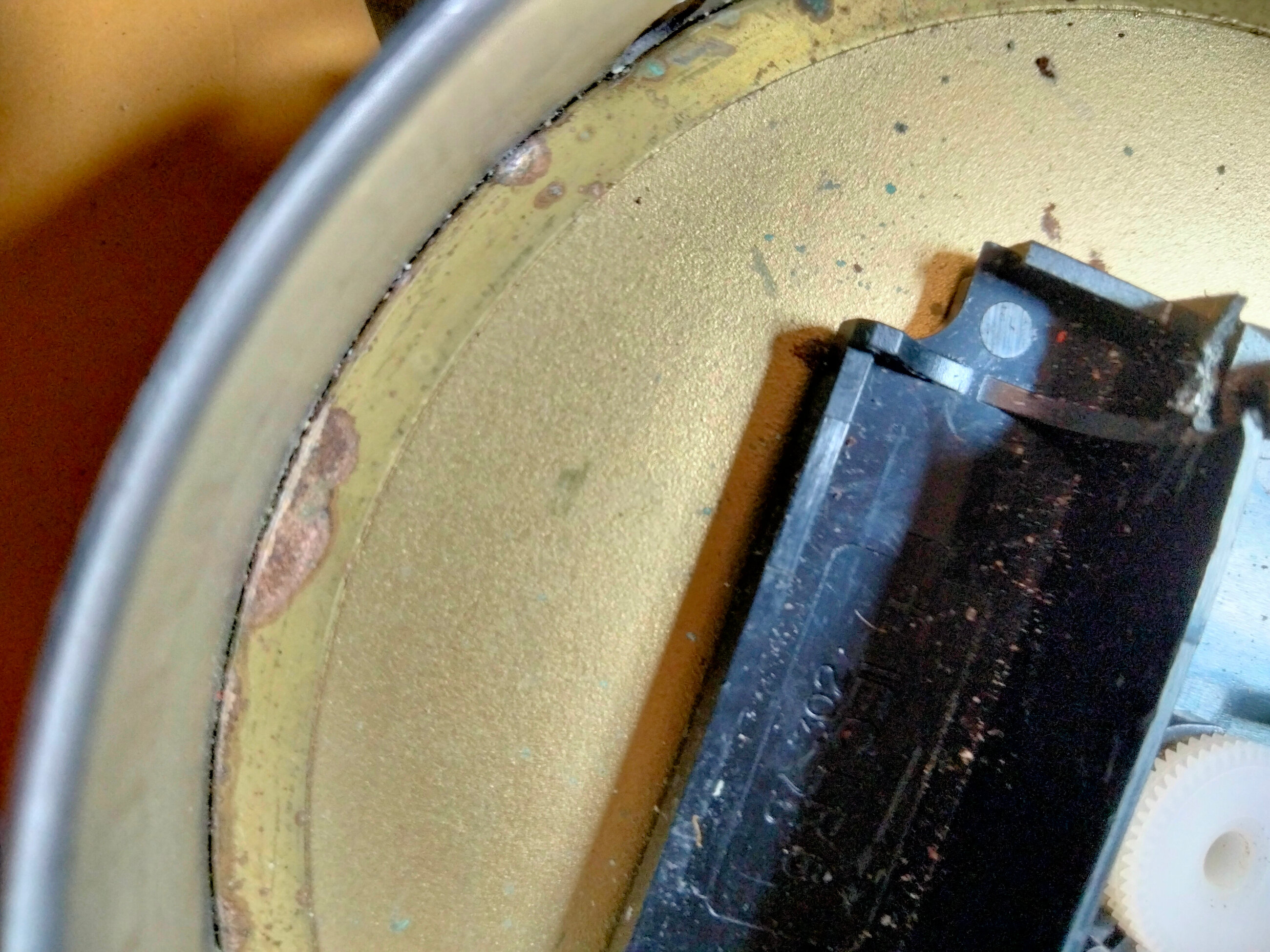 Le support du mécanisme (pièce noire) avec de l’autre coté le cadran est collé sur la pièce marron (ou jaune ?, j’ai un défaut de perception des couleurs). La pièce marron était rentrée en force dans le boitier, le cerclage lui rentre dans le boitier sans effort.