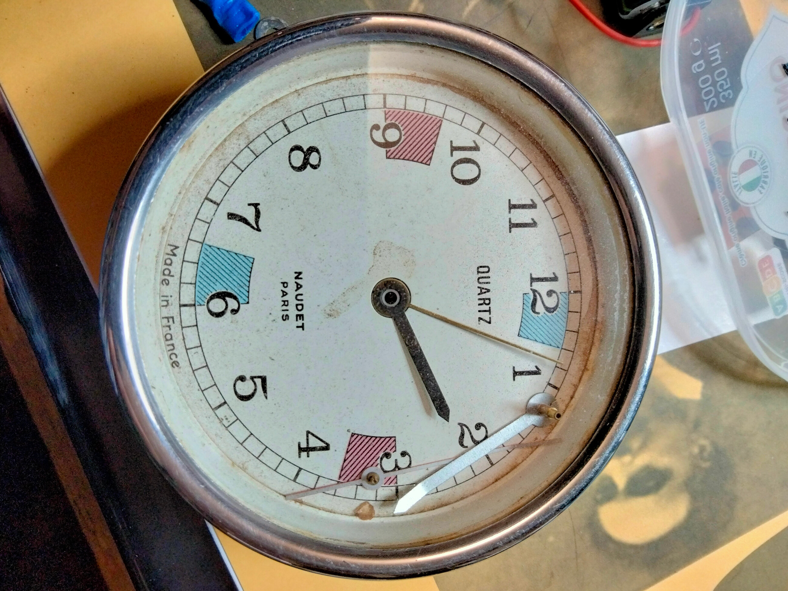 J’ai récupéré une pendule marine Naudet qui un rapport avec la radio car c’est une réplique de celle qui était dans les cabines radio des navires. Leur particularité était de comporter 4 zones colorées indiquant les 3 minutes de silence radio.