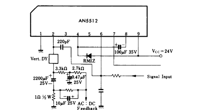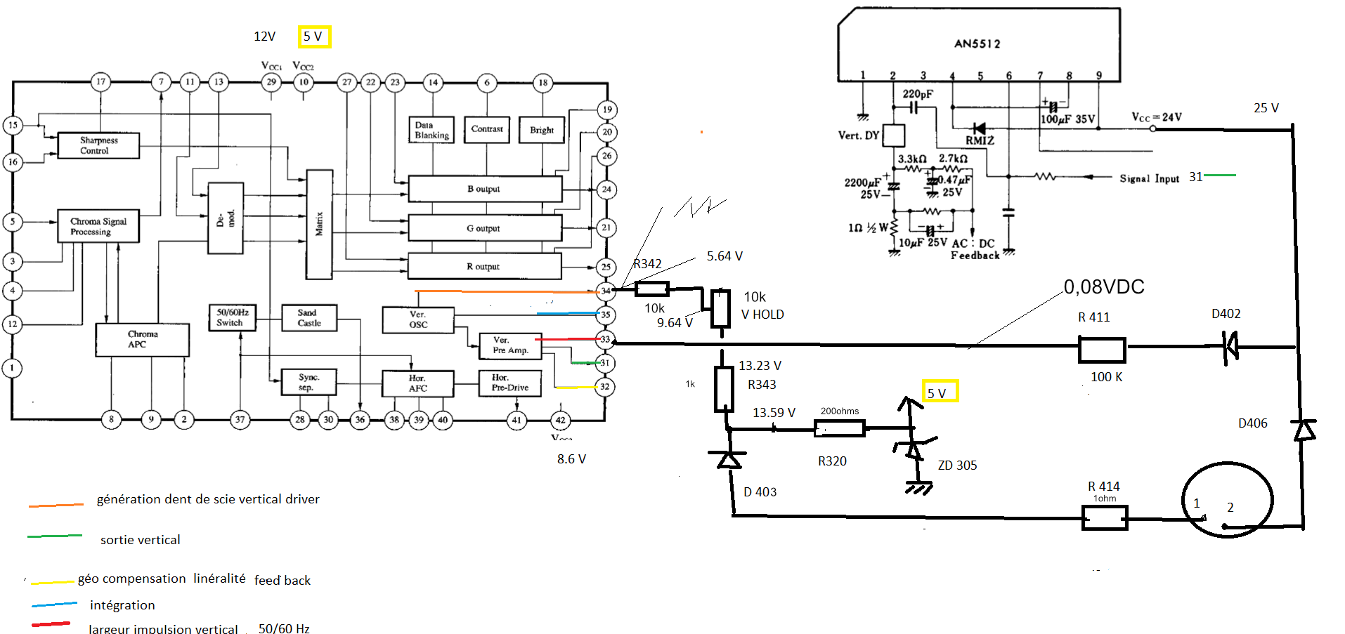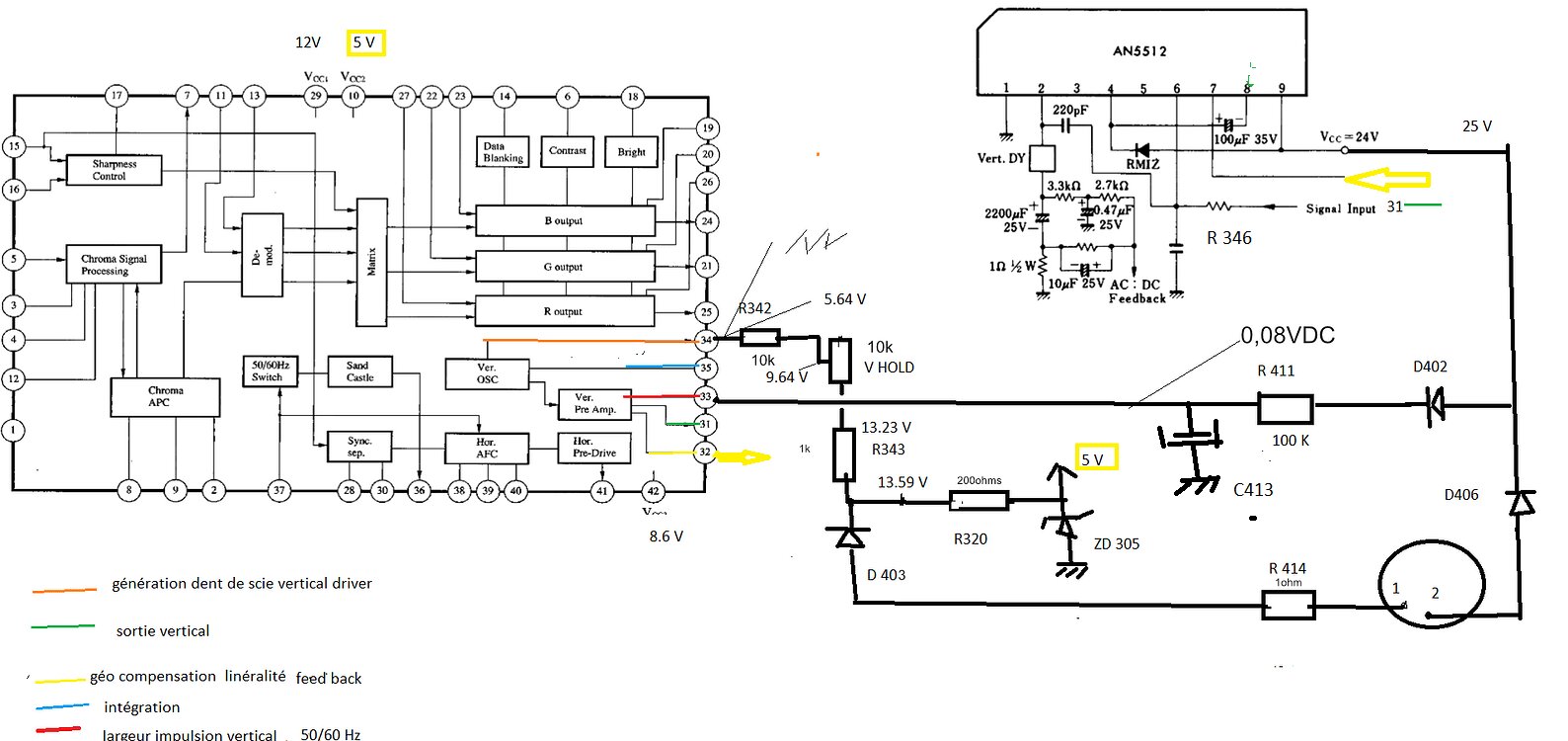 Le schéma du TV peut être différent par rapport à celui d’application, notamment le 2200MF câblé directement à la sortie de l’ampli, avant le déviateur.