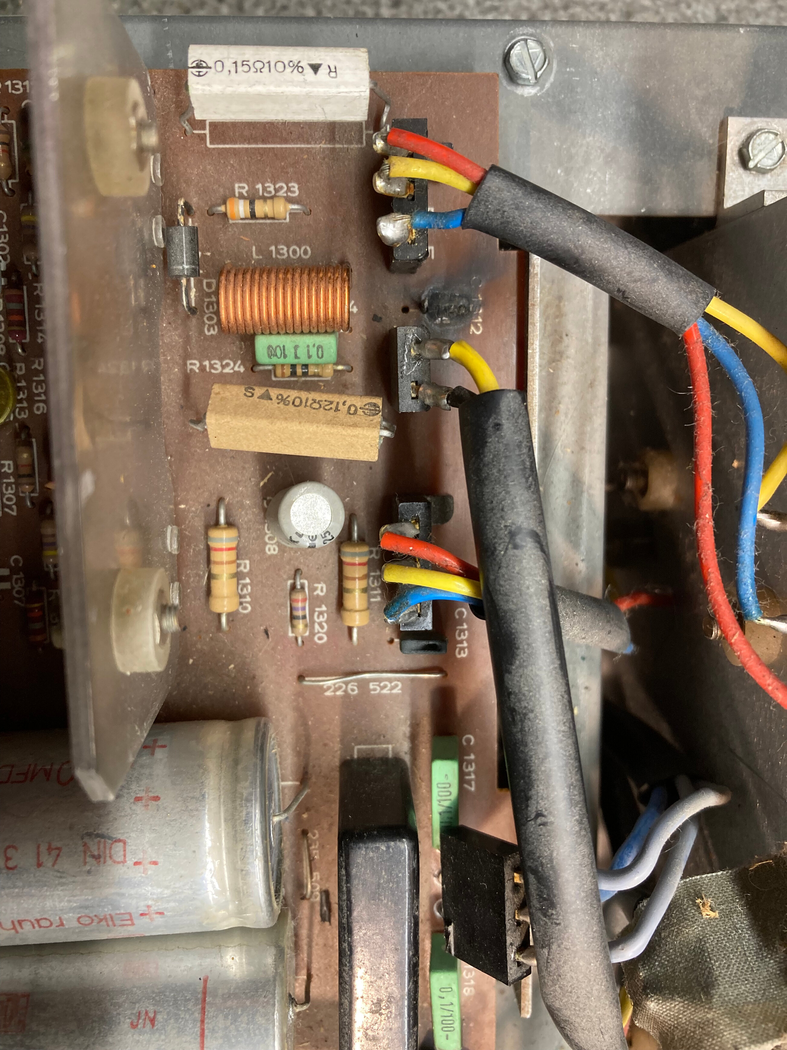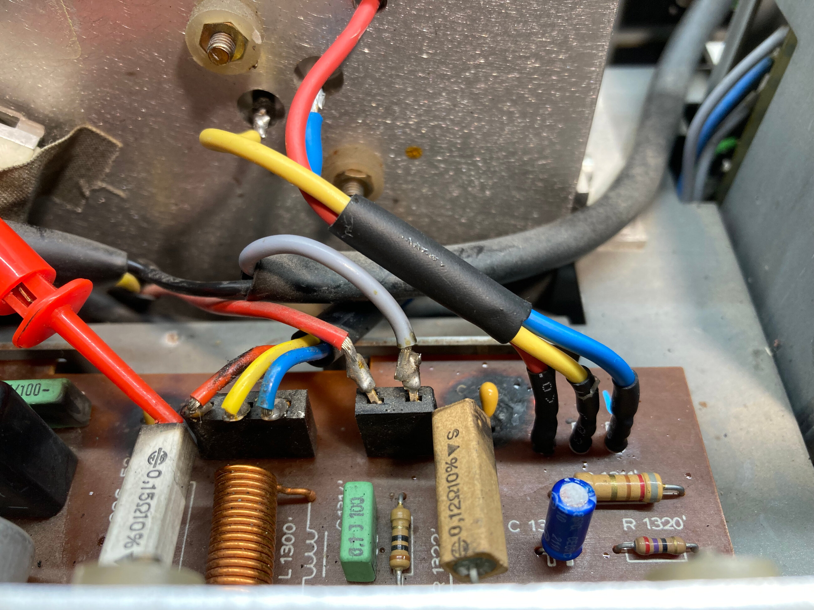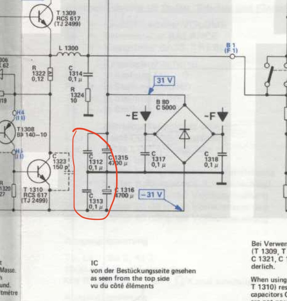 vérifiez la continuité entre le point commun des capas 1312/1313 et la masse commune de l’ampli, soudure, piste coupée, etc…