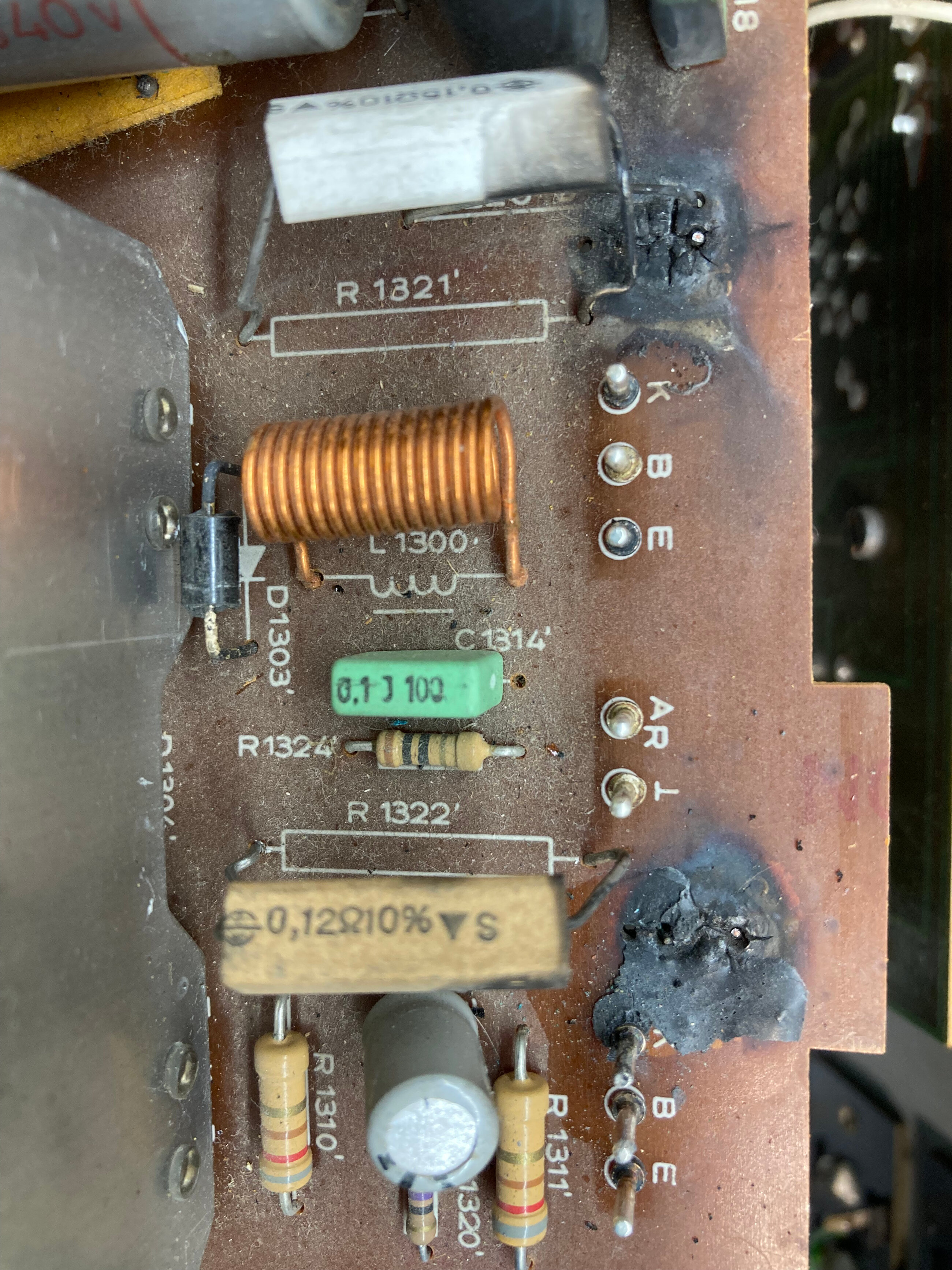 C’ est bien la première fois que je vois des céramiques brulés,qu’ est ce qui a bien pu provoquer ça?, les condensateurs C1315/1316 on l’ air ok, est ce que c’ est lié à la destruction de C1320 ?;