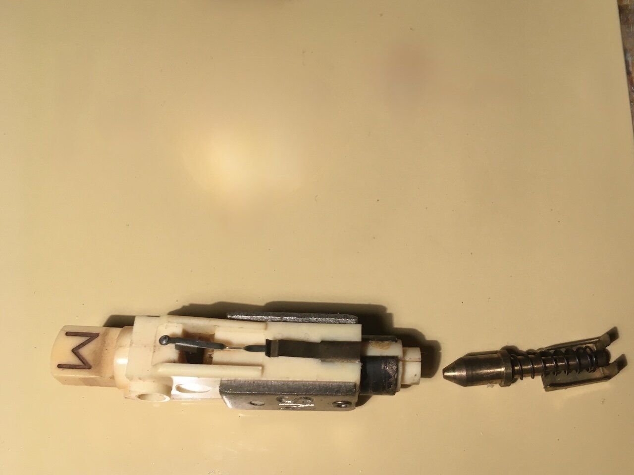 Pour l’instant, je me suis contenté à remettre en place l’axe étagé sur lequel frotte le galet, à remplacer un ressort et à remettre en fonctionnement l’interrupteur. Le plateau tourne à toutes les vitesses et toutes les lampes s’allument. Par contre, pas de son.