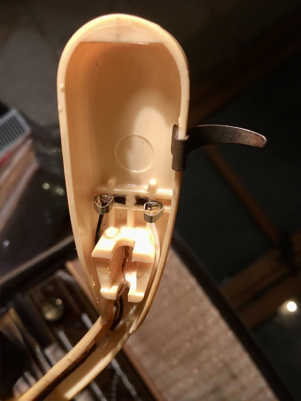 La cellule cristal est HS, le sel de Rochelle s’en échappe. Il n’y a aucun crachotement lorsqu’on touche les stylets. Par contre, l’ampli à l’air de fonctionner, cela crachote lorsque j’enlève la cellule et que je touche les fils.