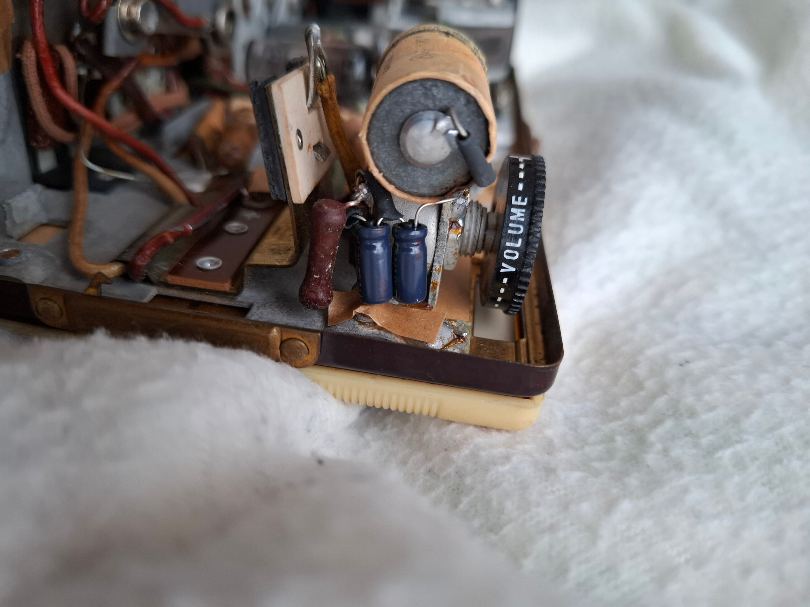 -Le 508 a fait l’objet d’une réparation, avec installation de deux condensateurs neuf, mais tout le reste semble d’origine. À part un faux contacts sur le condensateur variable des stations, sur la partie basse de la bande PO, il fonctionne bien.