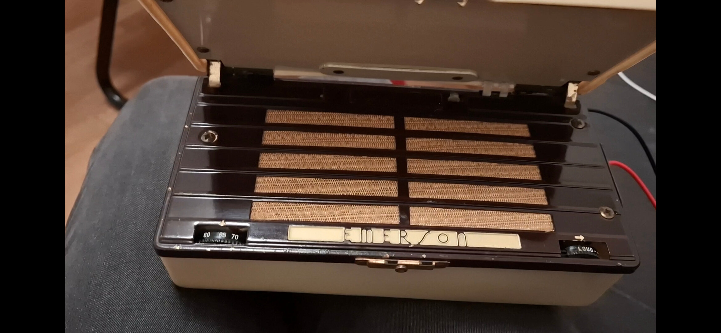 Depuis ce jeudi, je suis l’heureux propriétaire de ce petit Emerson 508 en parfait état de fonctionnement, à l’exception d’un léger faux contact sur le CV variable de la recherche des stations, comme vous pouvez le voir dans la première vidéo.
