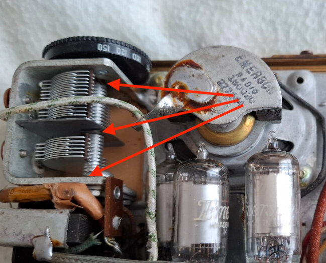 Ensuite, je retire tous les tubes, et là aussi il y a eu du remplacement. À la place du 1T4, j’ai un 1L4 de marque RCA, et l’un des tubes Emerson est sérigraphié en rouge alors que les autres sont en blancs. Évidemment, les broches sont oxydées, donc grattage au papier de verre, puis vérification à l’ohmmètre de la continuité des filaments. Tout est ok.