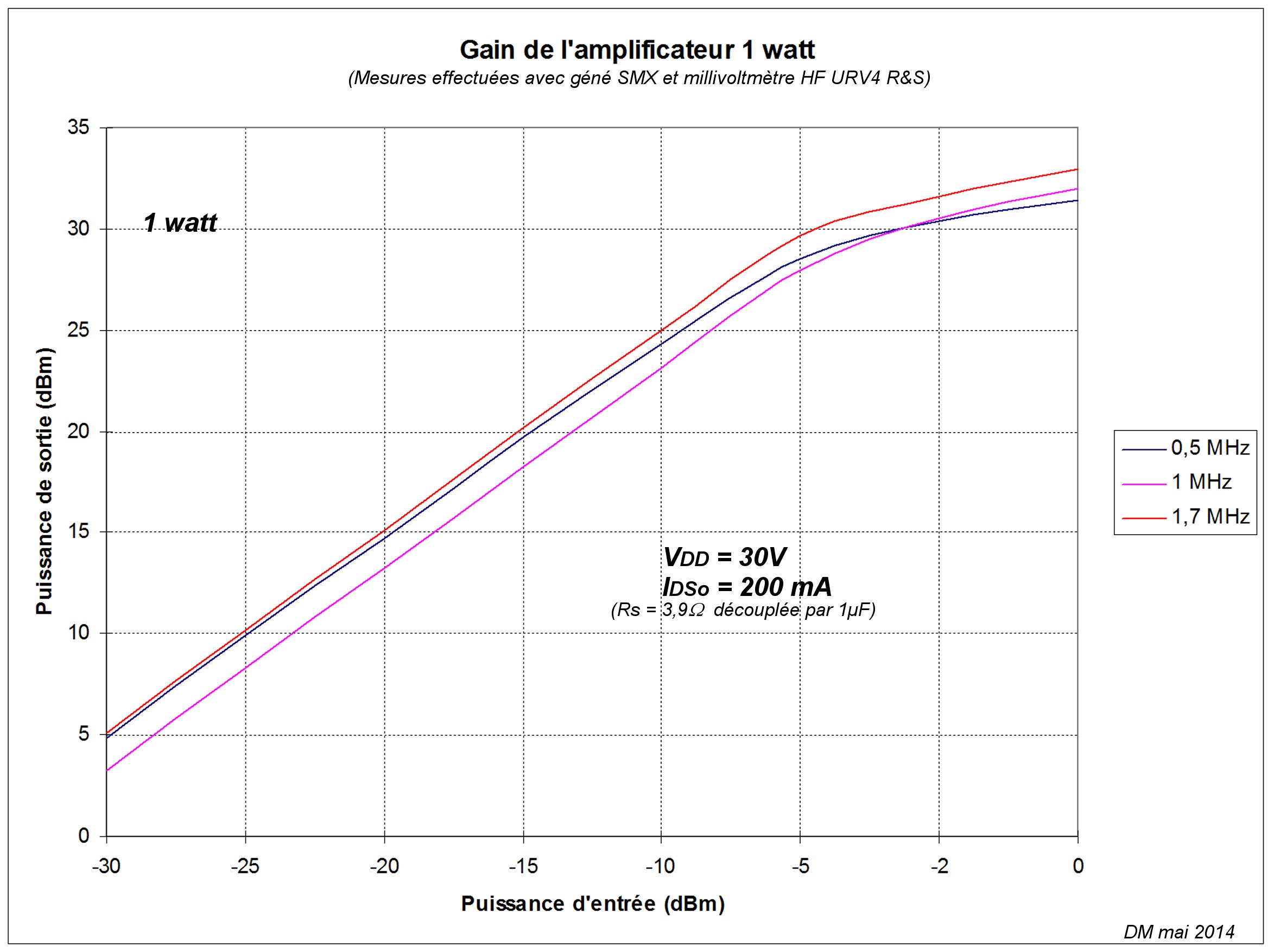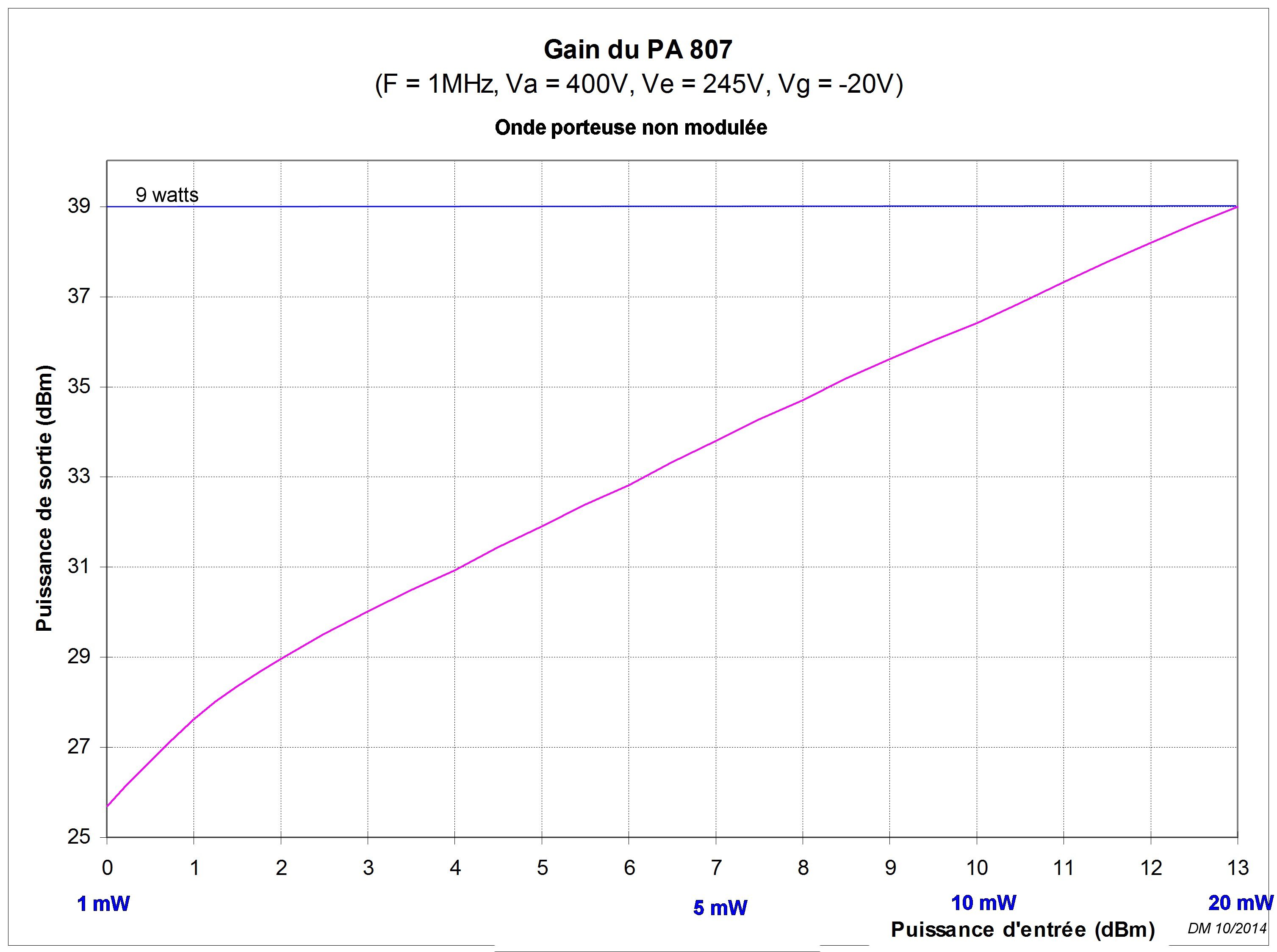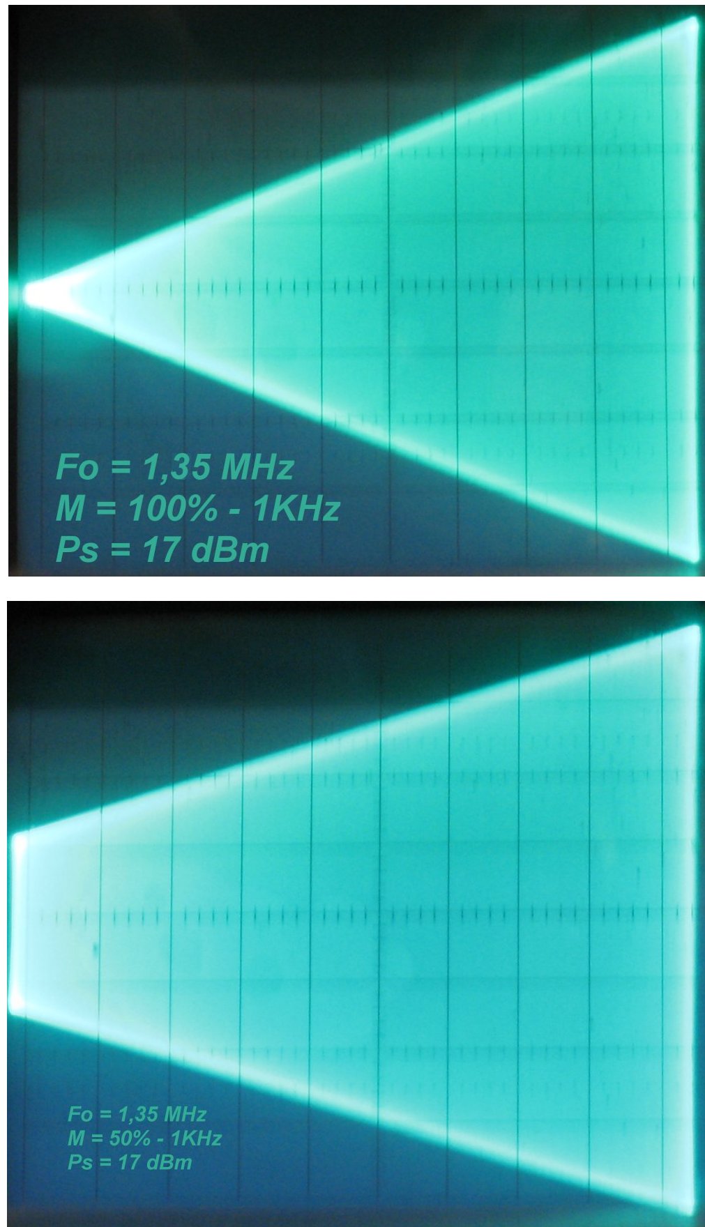 J’avais fait il y a une dizaine d’années des ampli pour mettre derrière un générateur en PO, que je publie ici à titre d’exemple. Le premier sort 1 watt avec un gain de 30 dB et le second avec la 807 une dizaine de watts. Ce sont des ampli linéaires, c’est-à-dire que l’on injecte à l’entrée le signal modulé en AM. Ci-dessous le triangle de modulation en sortie de l’ampli 1Watt.