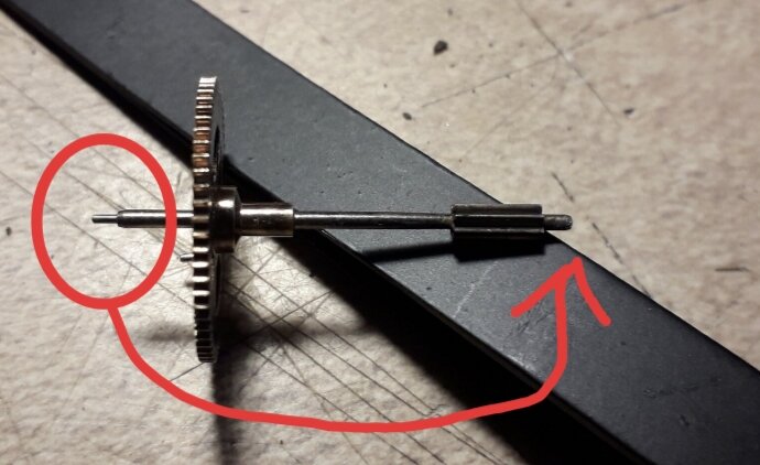 Il faudrait peut-être insérer un axe en perçant un alésage dans l’axe et insérer de force un téton. Refaire l’axe est plus compliqué, car il y a un pignon arbrè (Pignon usiné avec l’axe, donc pas de démontage) il faudrait usiner les dents avec un diviseur, avec une fraise au profil de denture horlogère. Il faudrait me donner le grand diamètre de l’axe après le pignon arbré, et le diamètre du téton cassé. Si il reste assez de matière pour percer l’axe, cela devrait être possible.