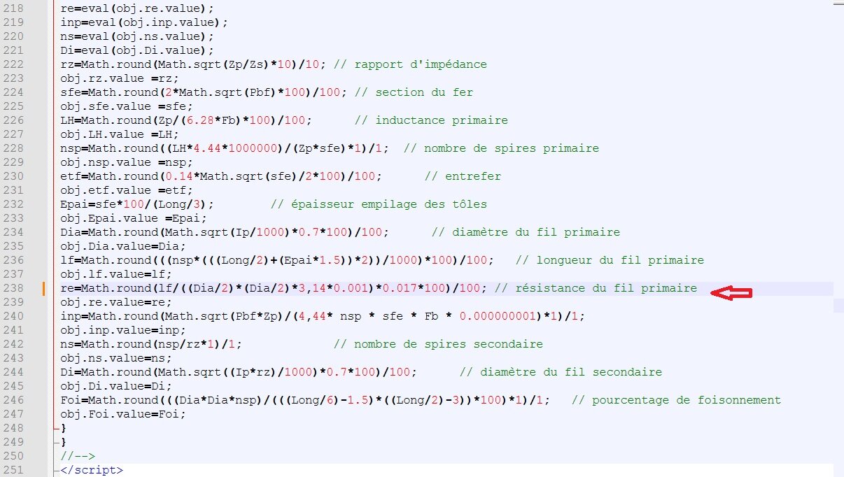 re=Math.round(lf/((Dia/2)*(Dia/2)3,140.001)0.017100)/100; // résistance du fil primaire