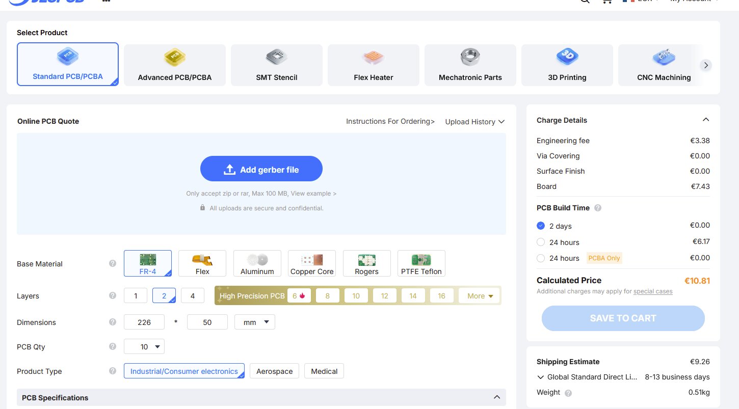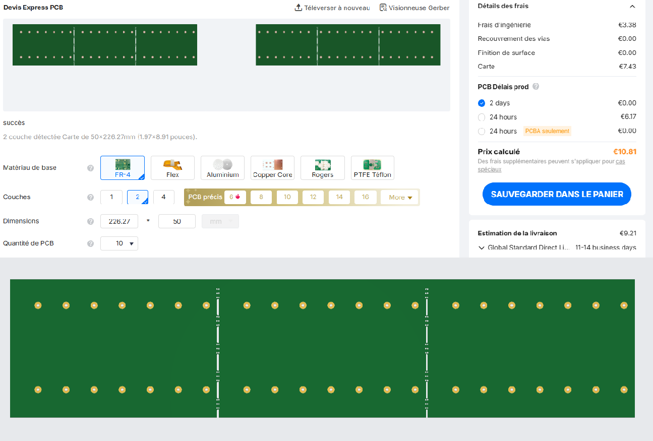 Pour les prix, il suffit de rentrer les dimensions et le nombre de couches, pas besoin d’envoyer un gerber. Cela ne dépend pas de ce qu’il y a sur le CI, sauf en cas de perçages ou fraisages en trop grand nombre, il peut y avoir alors une petite différence, mais qui n’arrive même pas dans l’interface mais après analyse avant fabrication.