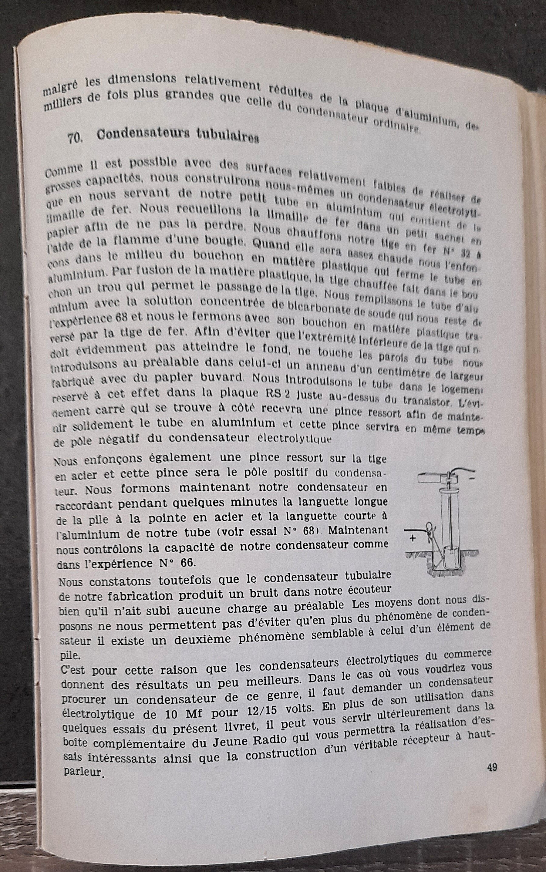 Voici la page consacré à la réalisation du condensateur électrolytique du Jeune Radio; la solution eau/ bicarbonate de soude est donnée à la page précédente : une cuillère de bicarbonate dans un « verre d’ eau ».
