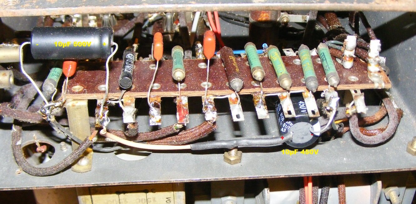 Effectivement ce schéma pourrait coller , par contre j’ai un condo de 8uF sous le chassis avec le + sur le + des 2 autres et le - vers la masse , visiblement il a été rajouté , si vous aves des photos de dessus et dessous du chassis cela m’aiderai , en attendant je vais rebobiner la HT 2 x 3530 spires ça va m’occuper un moment , merci pour l’aide apportée .