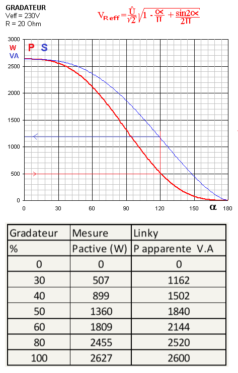 Un peu de théorie à partir de la tension efficace donnée par un gradateur et un calcul Excel de la puissance active P(W) et de la puissance apparente S(VA) montre que Linky est champion des mesures
