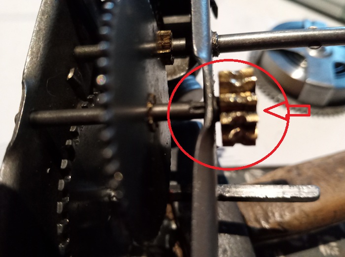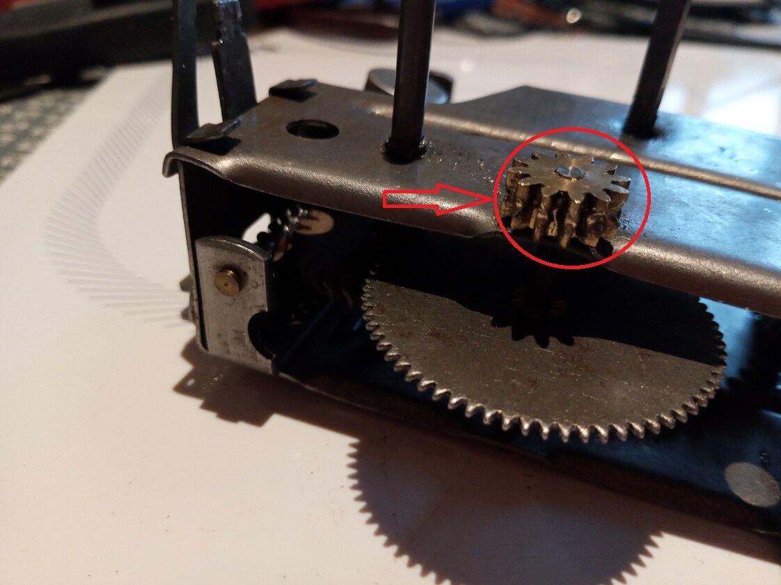 Ce pignon endommagé ressemble à ceux de « Meccano » de notre jeunesse. Sauf un coup de chance, il sera dur de trouver exactement le même en diamètre, nombre de dents, module, épaisseur et trou de montage sur l’axe.