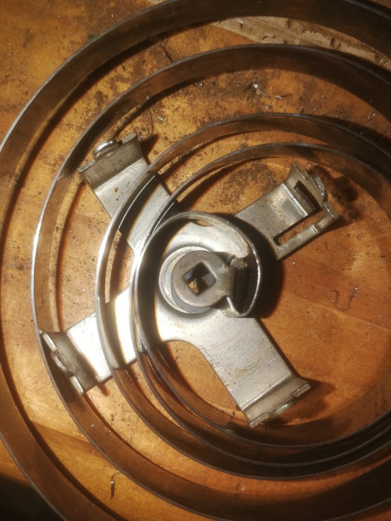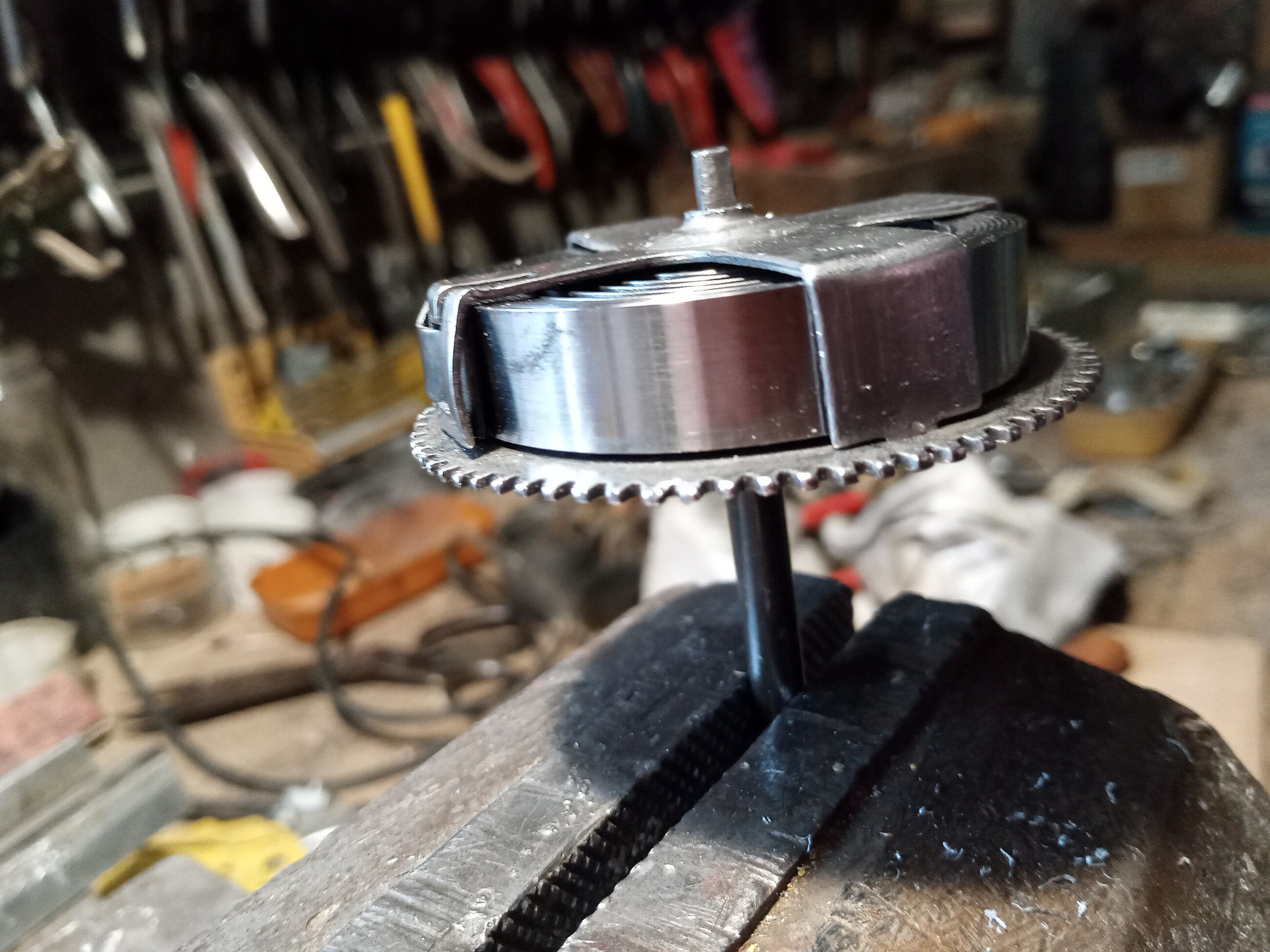Comme le ressort du moteur se décrochait ,surtout après son remontage par la manivelle,j’ai mis l’ensemble « couronne ressort » sur un axe que j’ai fabriqué ,le tout dans un étaux ,afin de voir le comportement de ce ressort.