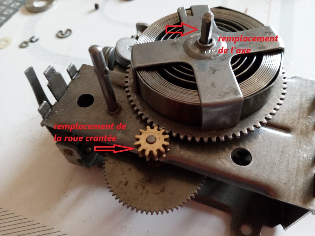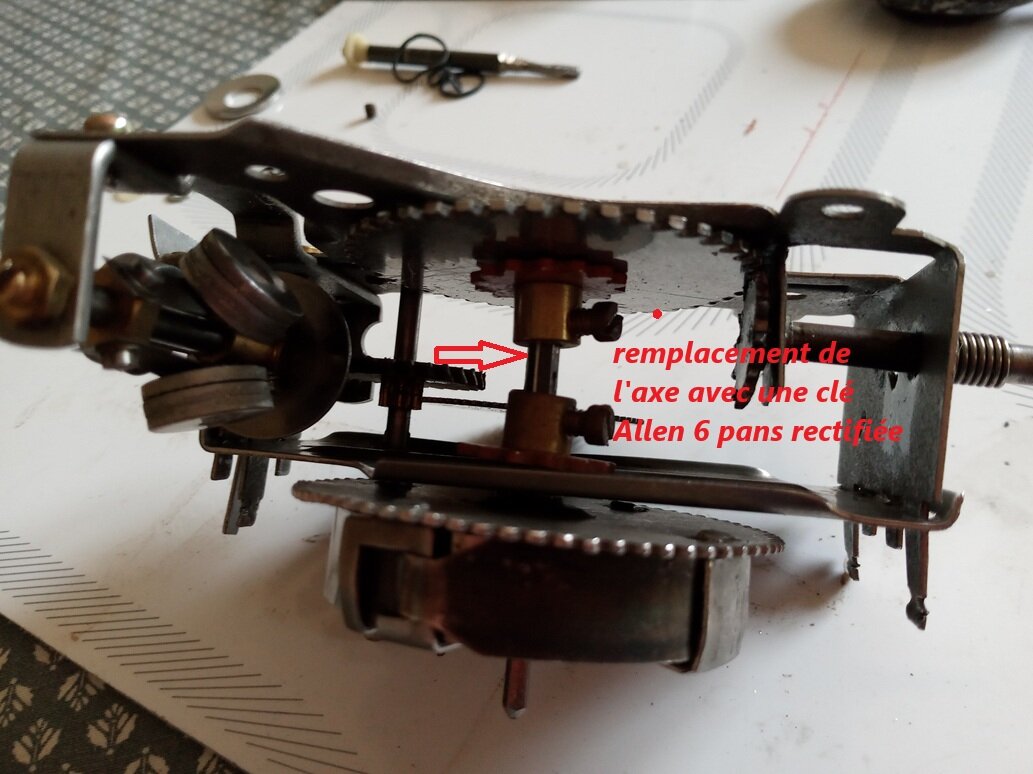j’ai dû refabriquer l’axe principal (liaison couronne manivelle vers ressort) qui était voilé
