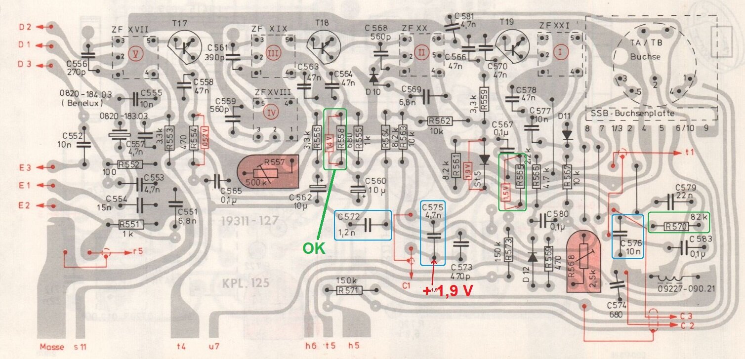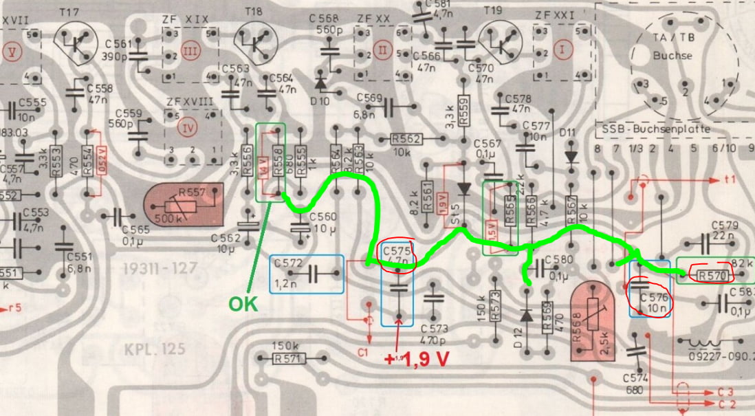 Masse au niveau de R561 et + au niveau du point avant le C575 : Résultat = -1,9 V