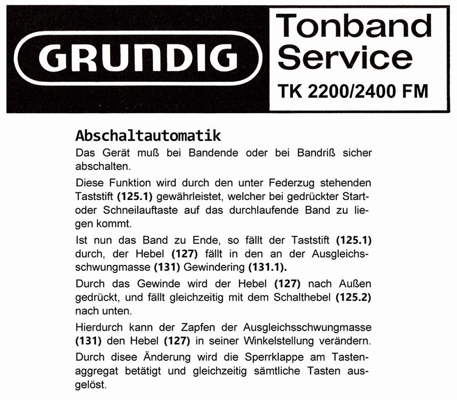 p 22, il est indiqué (en anglais mais non traduit en français) et sans doute ailleurs, que les bandes magnétiques GRUNDIG  comportent  une partie métallique aux extrémités pour l’arrêt automatique du moteur.