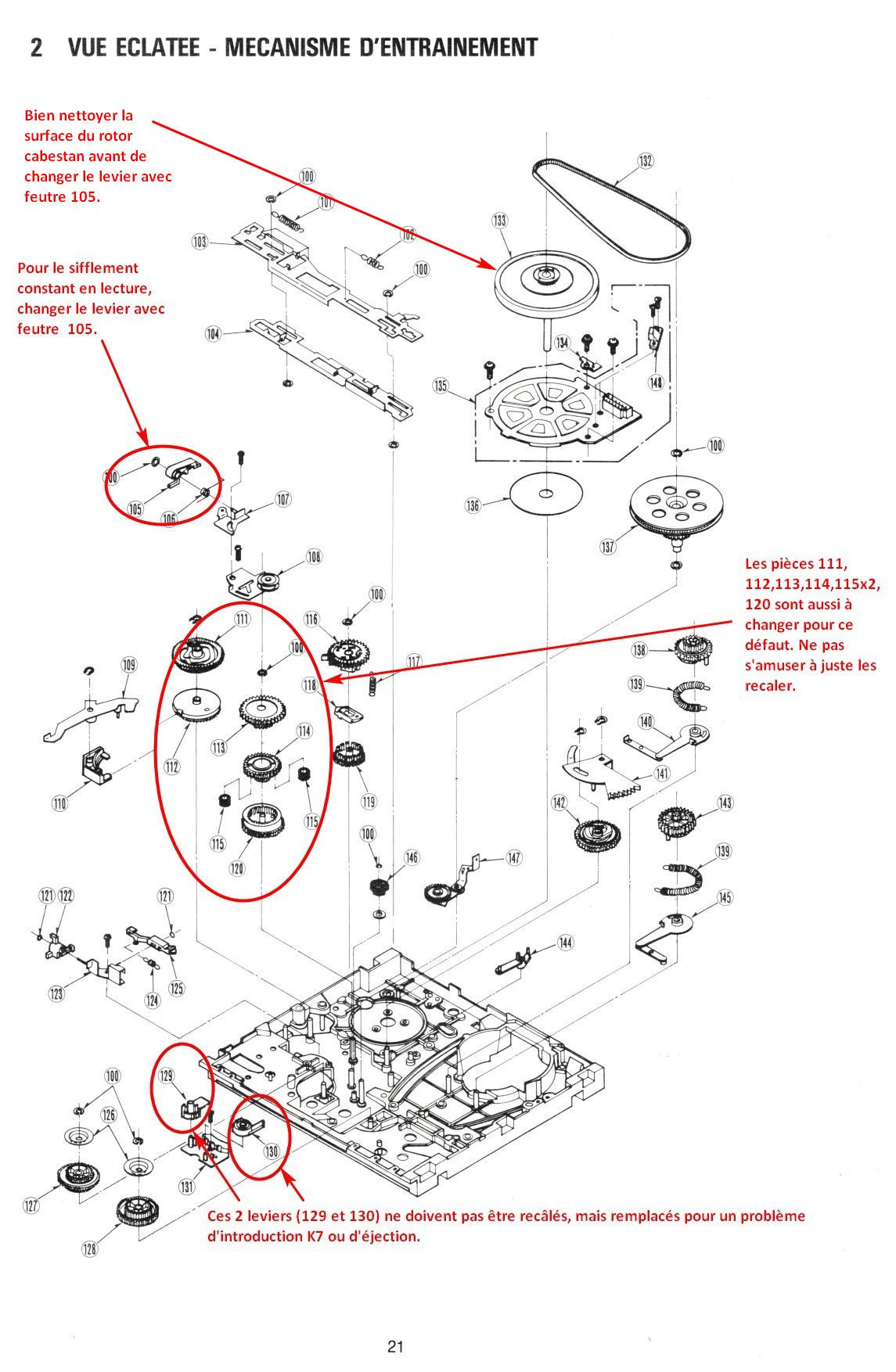 Si le levier 130 est cassé, méfie toi de l’ensemble des poulies citées plus haut. Un dur mécanique peut en être la cause. Tu le sauras très vite !