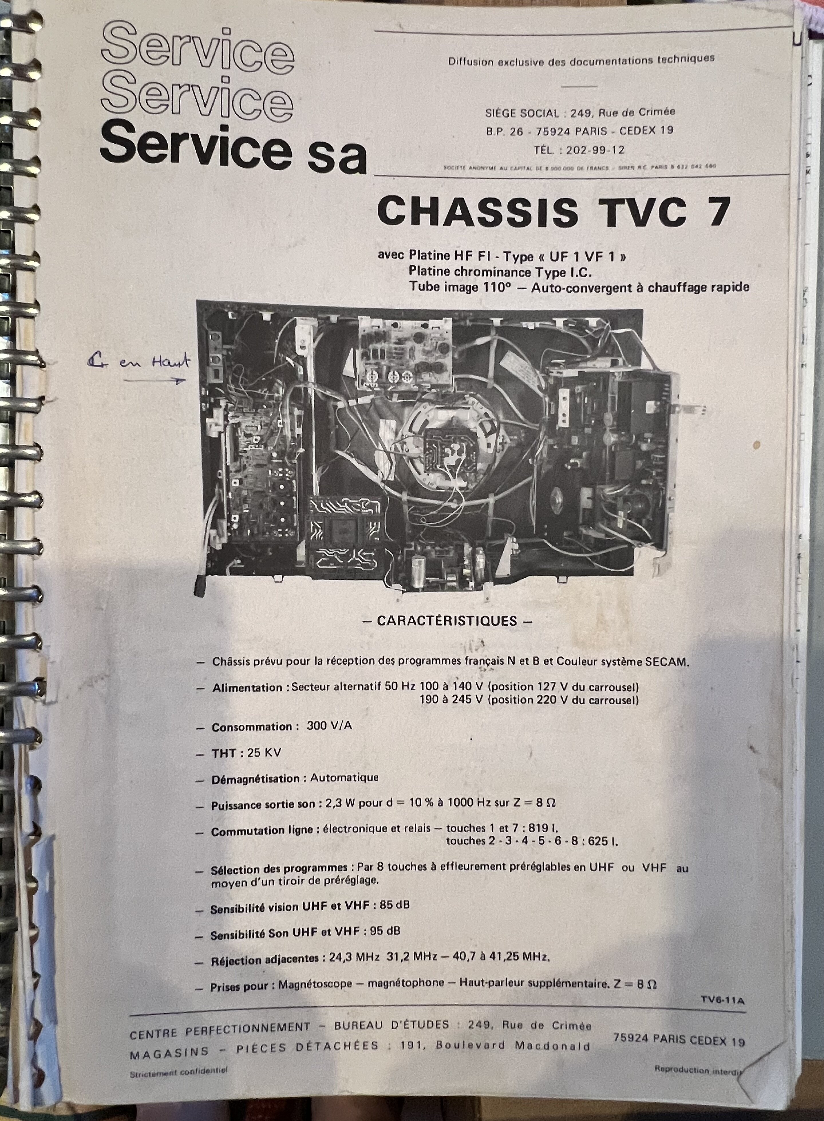 Parfois le schéma peut être à l’intérieur du TV, scotché sur une paroi, sur un TV fabriqué en RDA j’ai eu ce cas là.