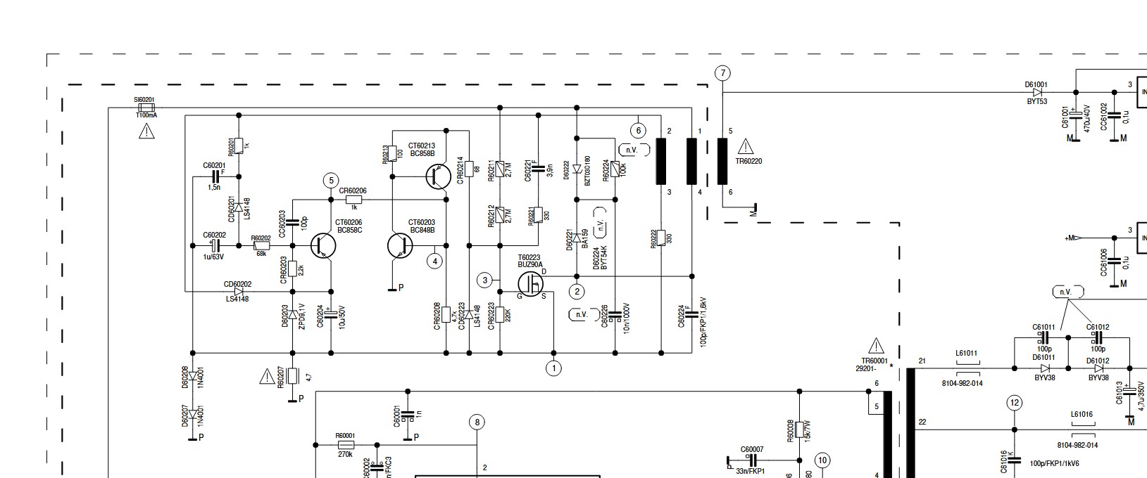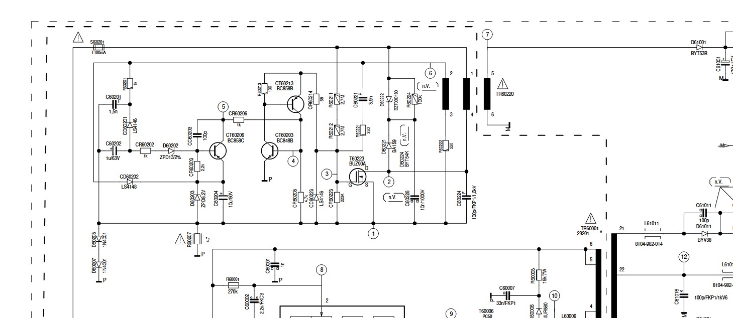 Il comporte une alimentation principale basée sur un TDA 4605/3, qui se répare sans difficulté. En parallèle, une petite alimentation auxiliaire, utilisant un BUZ 90, fournit la tension +Eco (environ 15 V) et est intégrée au châssis principal.