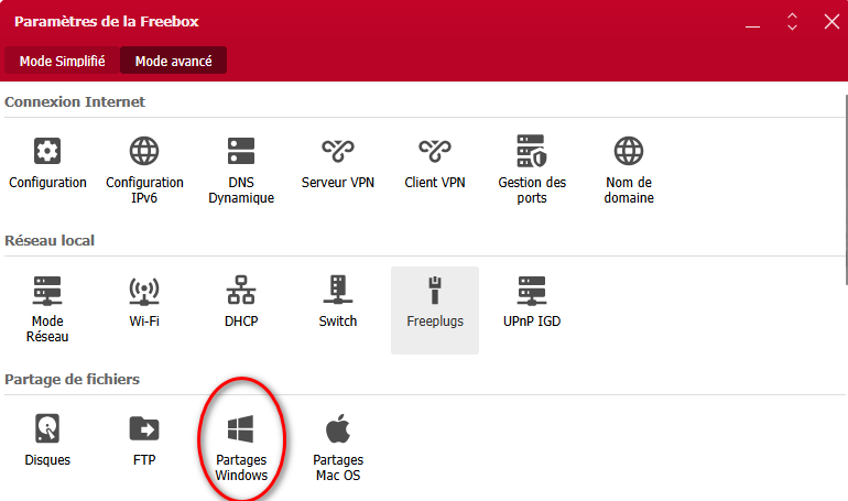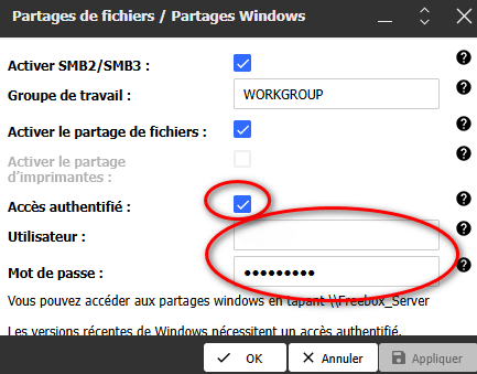 Ensuite, dans Paramètres de la Freebox – Mode avancé – Partage Windows – Partage de fichier / Partage Windows, cochez : Accès authentifié (les 2 autres cases doivent être aussi cochées)