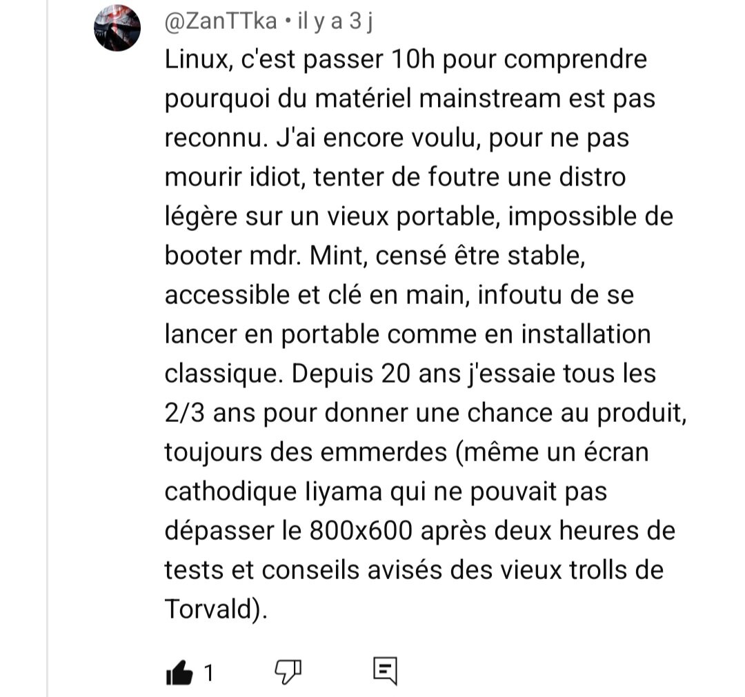 Mais il faut accepter de reconnaître que pour le non informaticien, les choses ne sont pas immédiates avec Linux. On ne dit rien d’autre. Et on dit aussi que la souplesse de Linux autorise bien plus de choses que Windows, mais au prix d’une complexité qui peut rebuter.