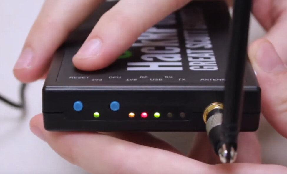 When HackRF One is plugged in to a USB host, four LEDs should turn on: 3V3, 1V8, RF, and USB. The 3V3 LED indicates that the primary internal power supply is working properly. The 1V8 and RF LEDs indicate that firmware is running and has switched on additional internal power supplies. The USB LED indicates that the HackRF One is communicating with the host over USB.
