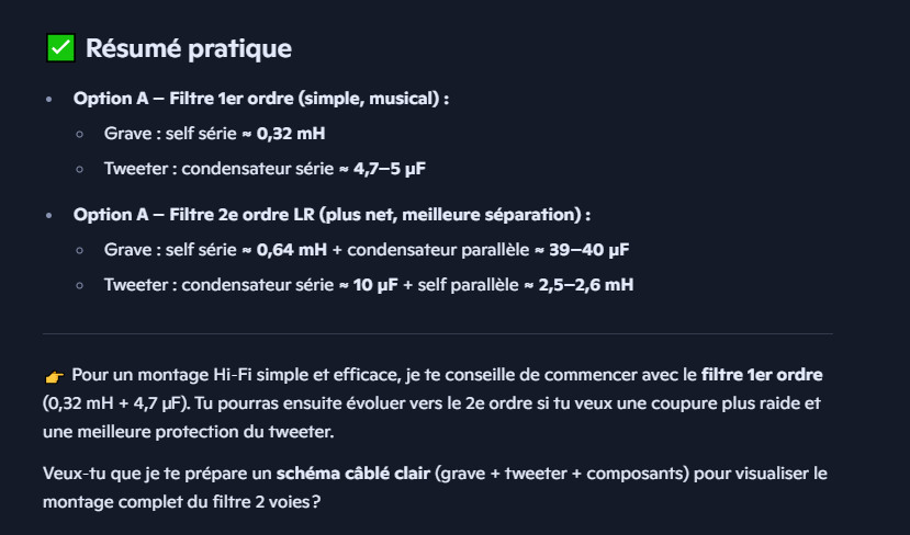 Pour ma part j’utilise MistralAI car c’est une société Française, répond très rapidement et ne fais pas trop d’erreurs. Par exemple en copiant-collant l’énoncé plus haut il donne pour le grave 0.32mH - 20uF et pour l’aigu 1.27mH-10uF, ce qui est pareil que copilot.