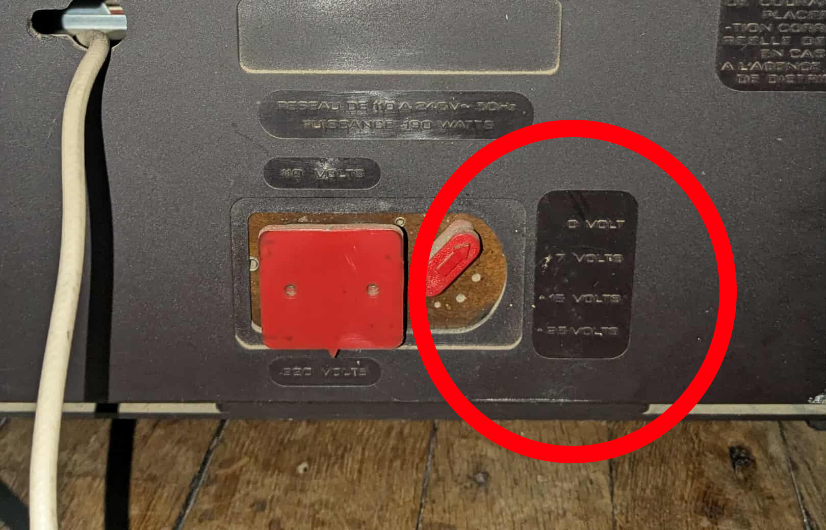 c’est assez explcite : le sélecteur porte/fusible est en position 220 V , le cavalier de droite permet d’ajuster la tension à