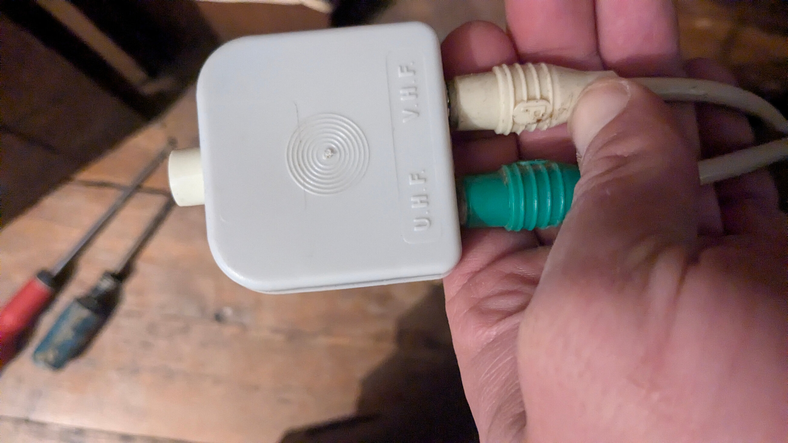 Pour le diamètre IEC 9mm de l’ entrée antenne UHF verte ou blanche, on peut réaliser un petit bout de coaxial avec une femelle de 9,5 mm et un mâle de 9 mm, mais si vous essayez de faire le branchement comme sur la photo, vous ne trouverez pas de signal sur le canal 36 UHF car ce scope n’ a pas de modulateur !