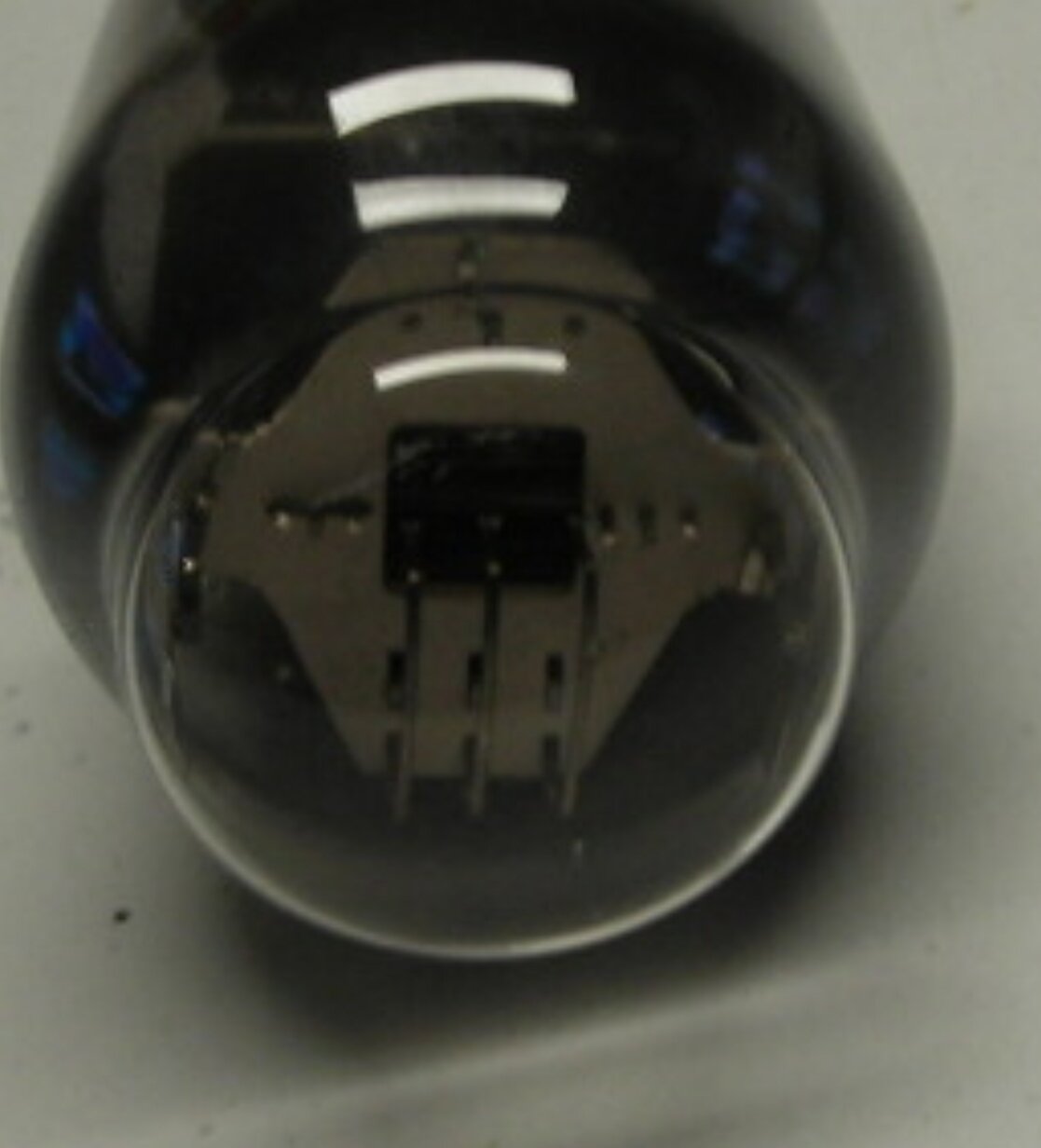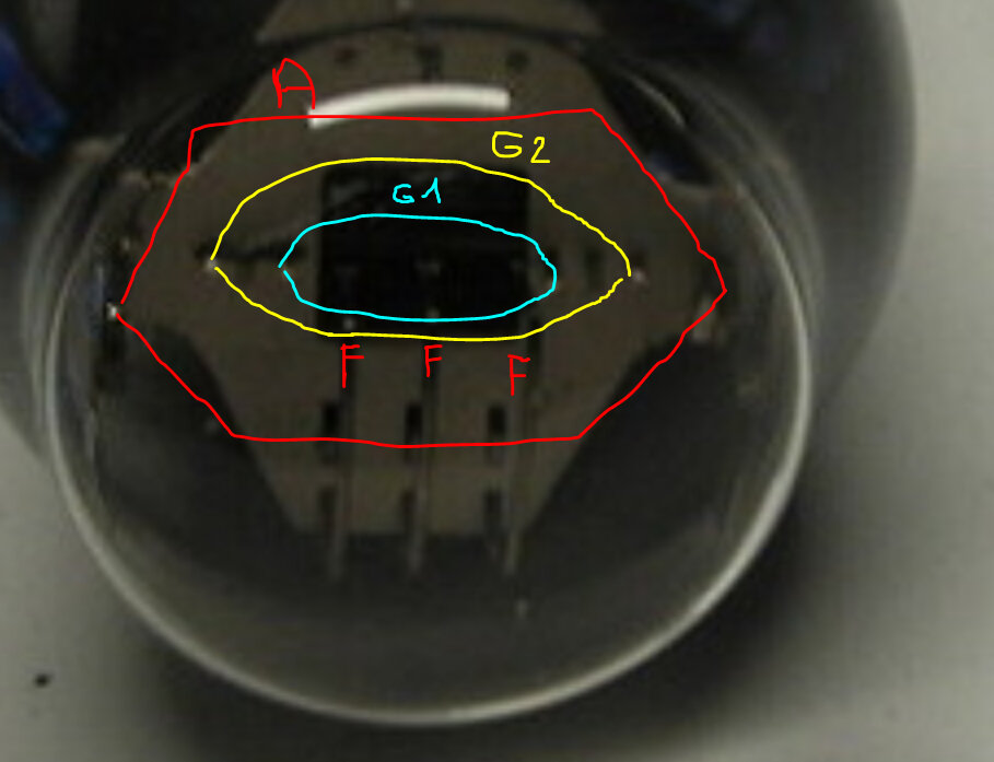 Oui, on vois, au centre : les 3 crochets supports de filament, puis de part et d’autre, les 3 montants des 3 grilles (c’est bien une pentode B.F )