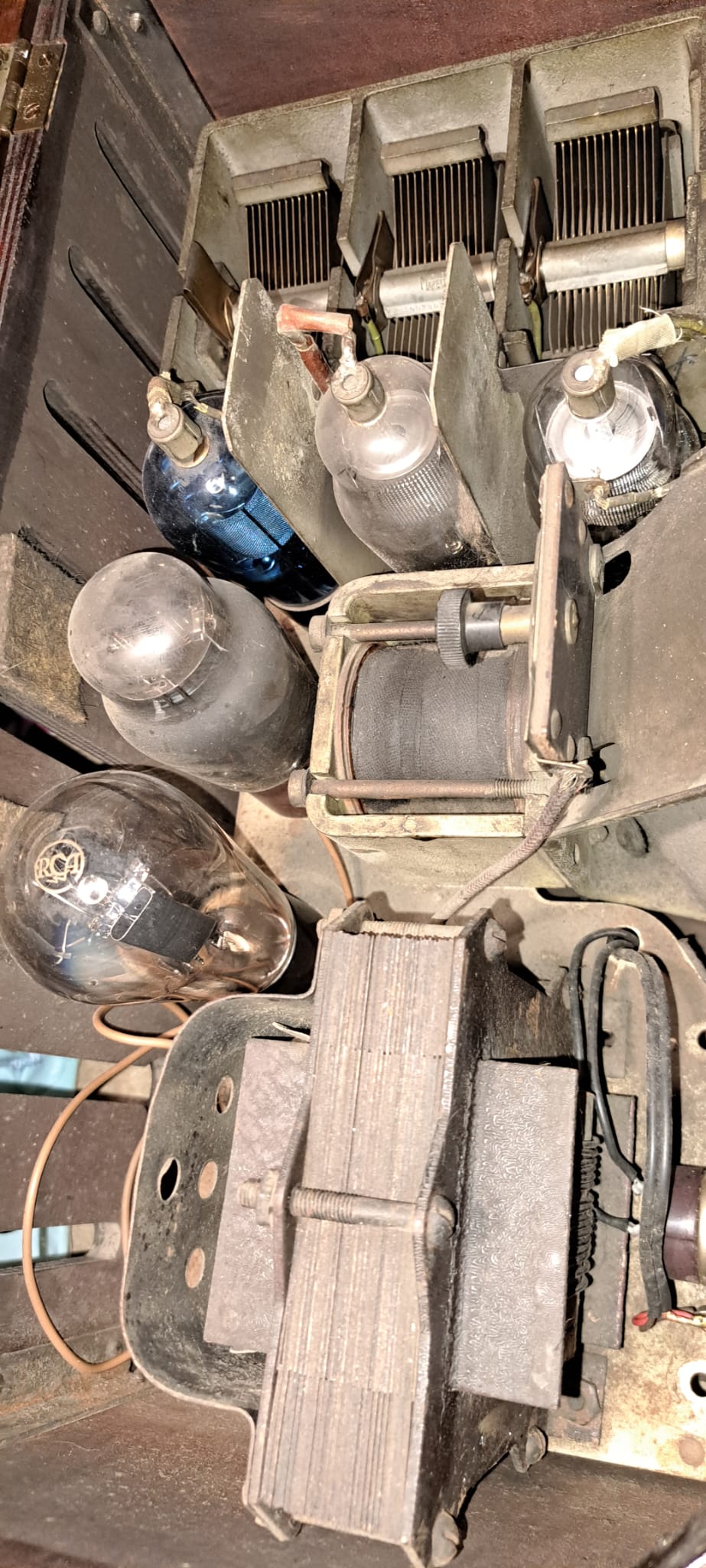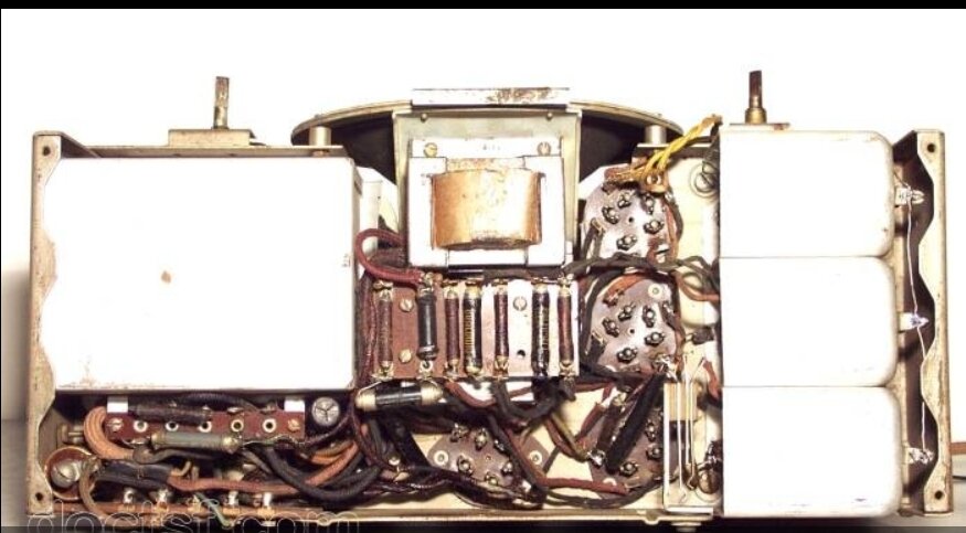 Ils étaient contenus, dans les trois blindages situés, juste en dessous du CV. On voit également , le « jack » de liaison du « pic up », qui nous donne l’ordre de ces bobinages .