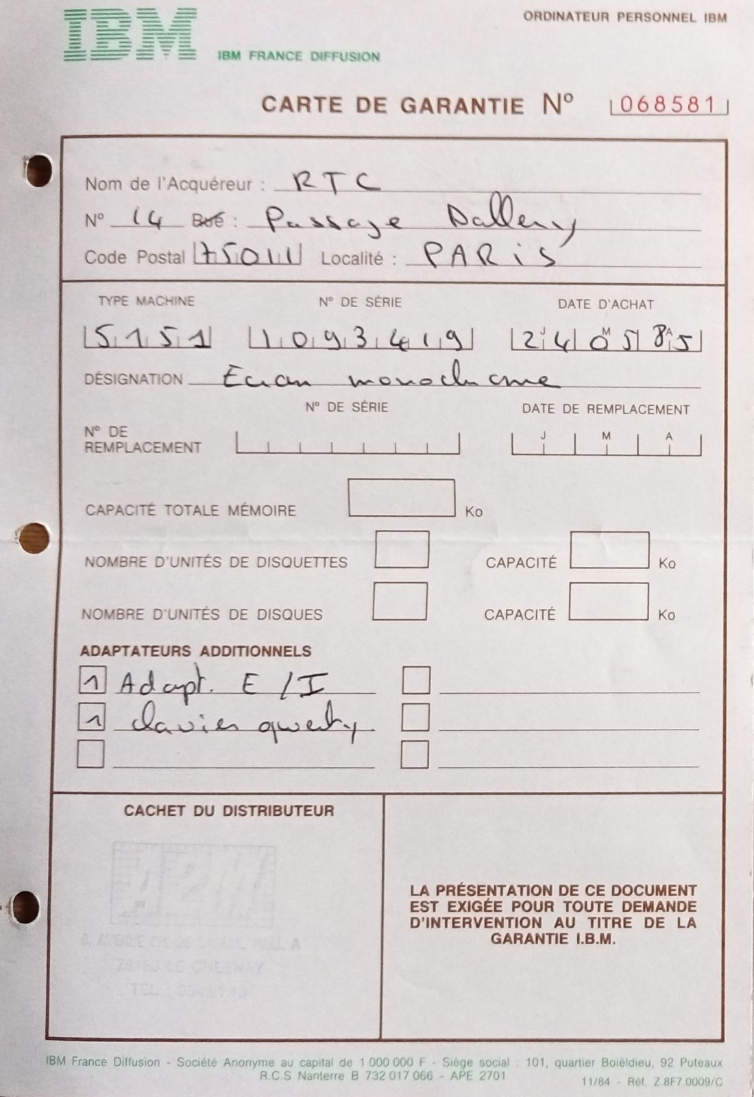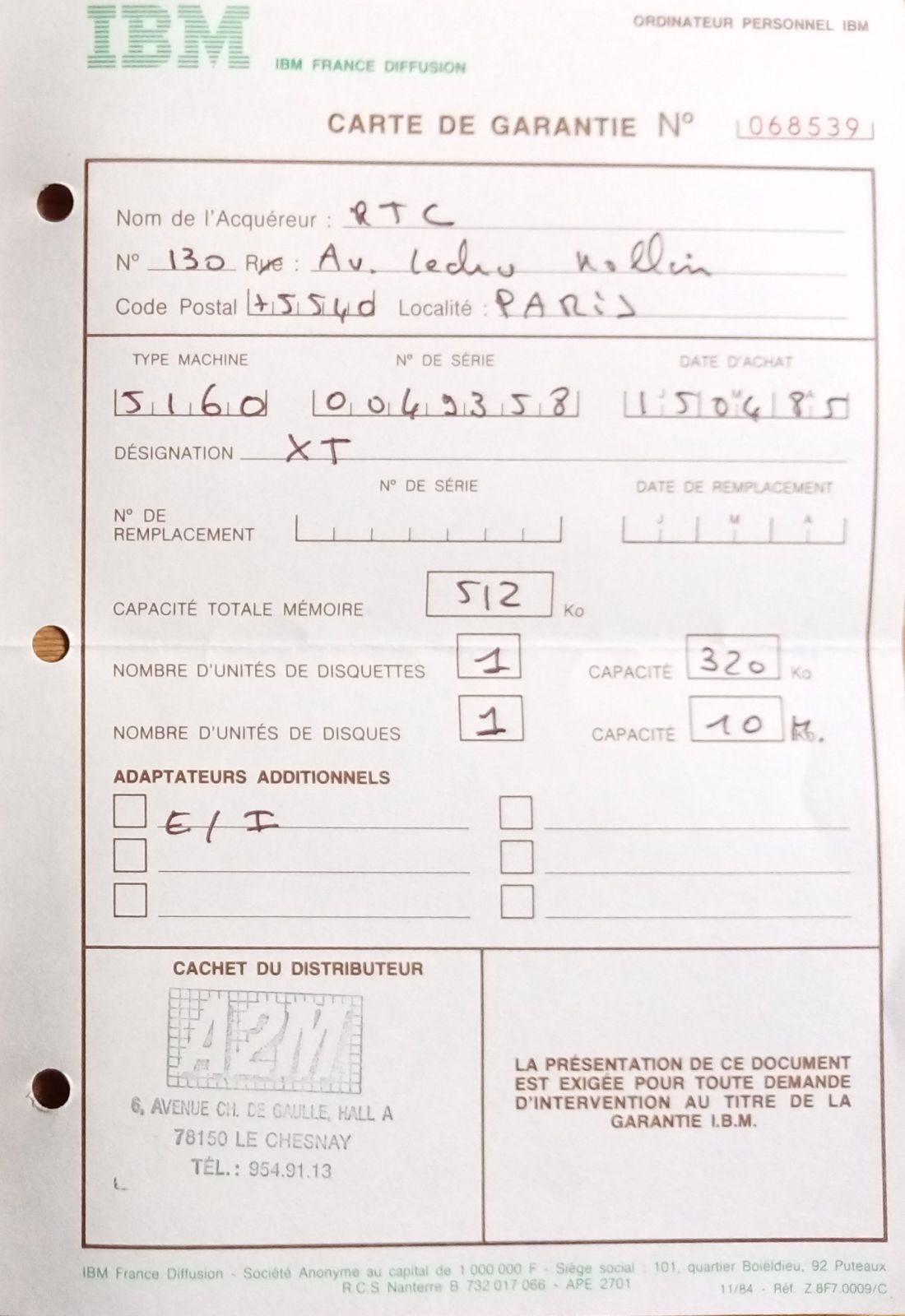 Je viens de retrouver dans mes archives les bons de garantie pour un IBM XT et son écran achetés en 1985 par mon employeur RTC.