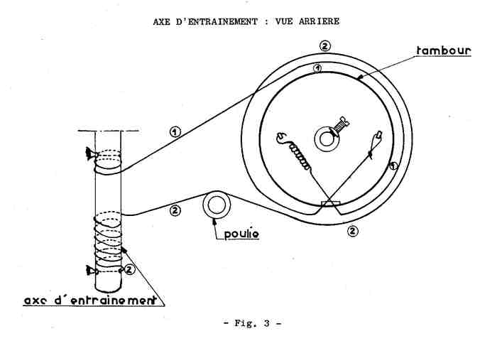 Entre temps, et souhaitant pouvoir utiliser le poste rapidement, au moins en FM, j’ai rétabli l’entrainement de la tête FM, « directement » , de l’axe de commande a la tête FM (sans passer par ces poulies et renvoi…) et en réutilisant une des ficelles d’origine et encore saine (en ajoutant un galet tendeur car elle étais trop longue…)