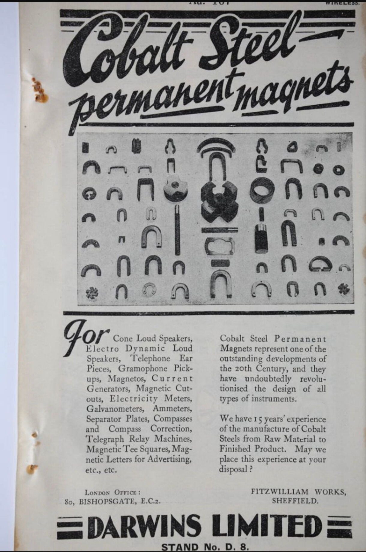 Voici une publicité d’un journal datant de 1930 (source : File:Im1930BIF-16925.jpg - Graces Guide). On peut reconnaître les aimants utilisés par les moteurs de haut-parleurs Philips.